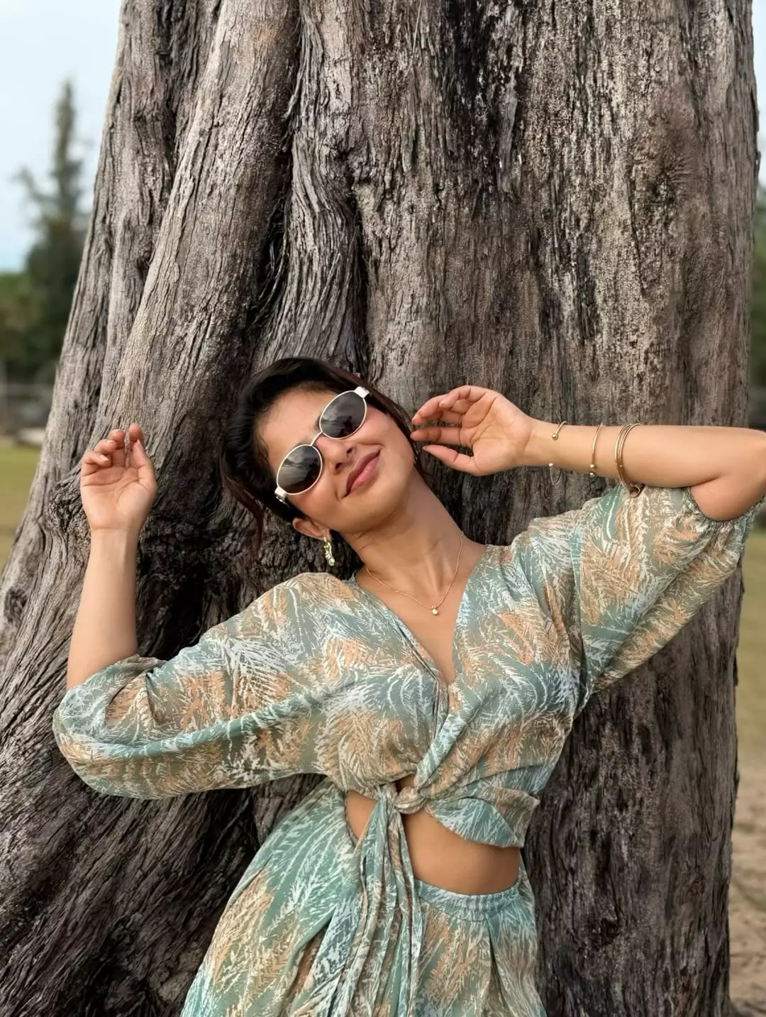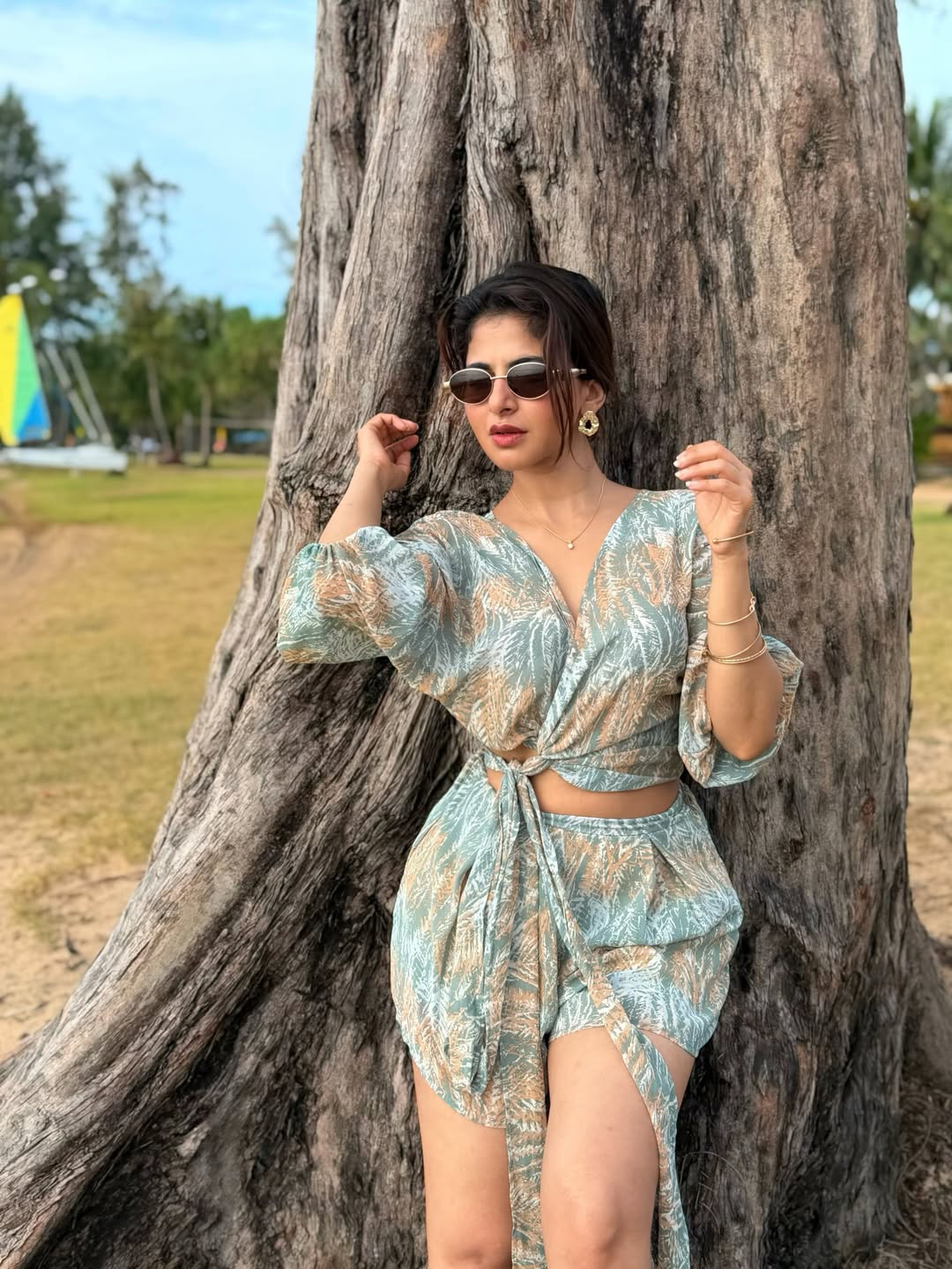 Indian actress Iswarya Menon, celebrated for her work across Tamil, Malayalam, and Kannada cinema, channels effortless sophistication in a relaxed yet stylish outdoor look. She is seen wearing a wrap-style top featuring a delicate tie-front detail, paired with a coordinating bottom crafted from a lightweight, breathable fabric. Adorned with a soft botanical or floral print, the ensemble evokes a fresh, nature-inspired aesthetic that feels both contemporary and timeless.
