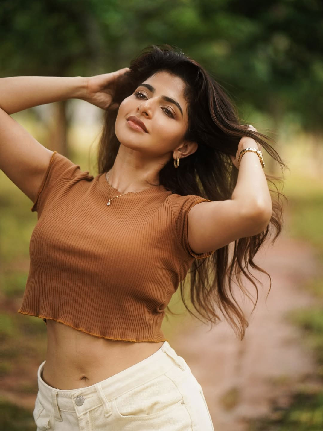 Set against a natural outdoor backdrop, the outfit blends seamlessly with its surroundings, accentuating her graceful presence and refined simplicity. Minimal accessories and natural makeup further elevate the look, ensuring the focus remains on the fluid design and tranquil vibe of the ensemble.