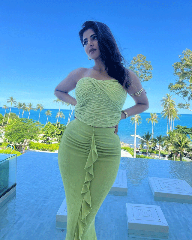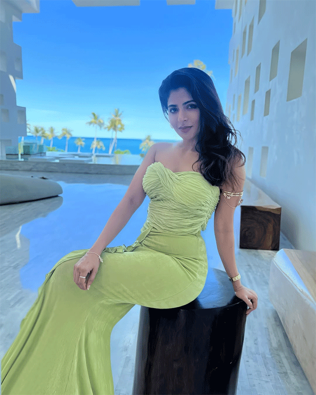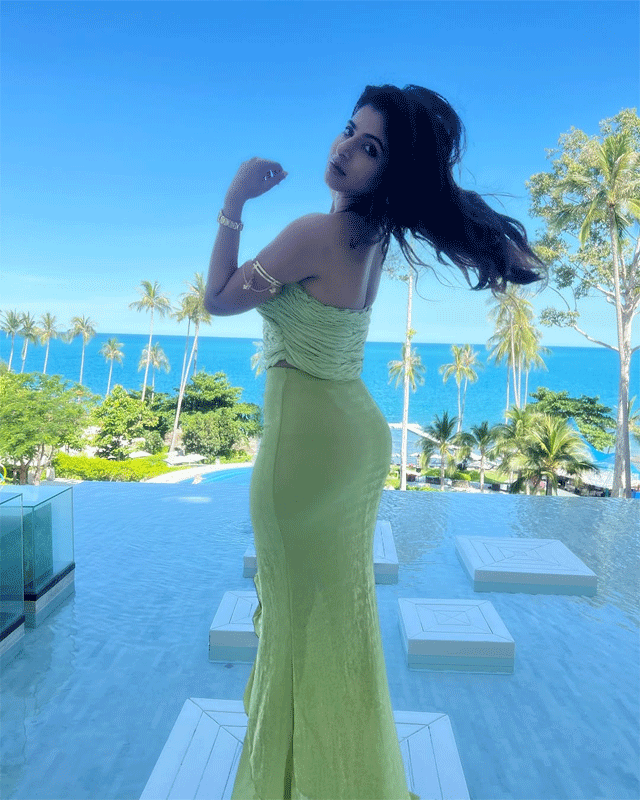 In recent Instagram photo, Iswarya Menon is seen soaking in tropical elegance at Hyatt Regency Koh Samui. Dressed in a chic light green ruched dress, she radiates vacation glamour against a backdrop of a serene infinity pool, swaying palm trees and a clear blue sea. Her caption read "Serving looks with a view to match."