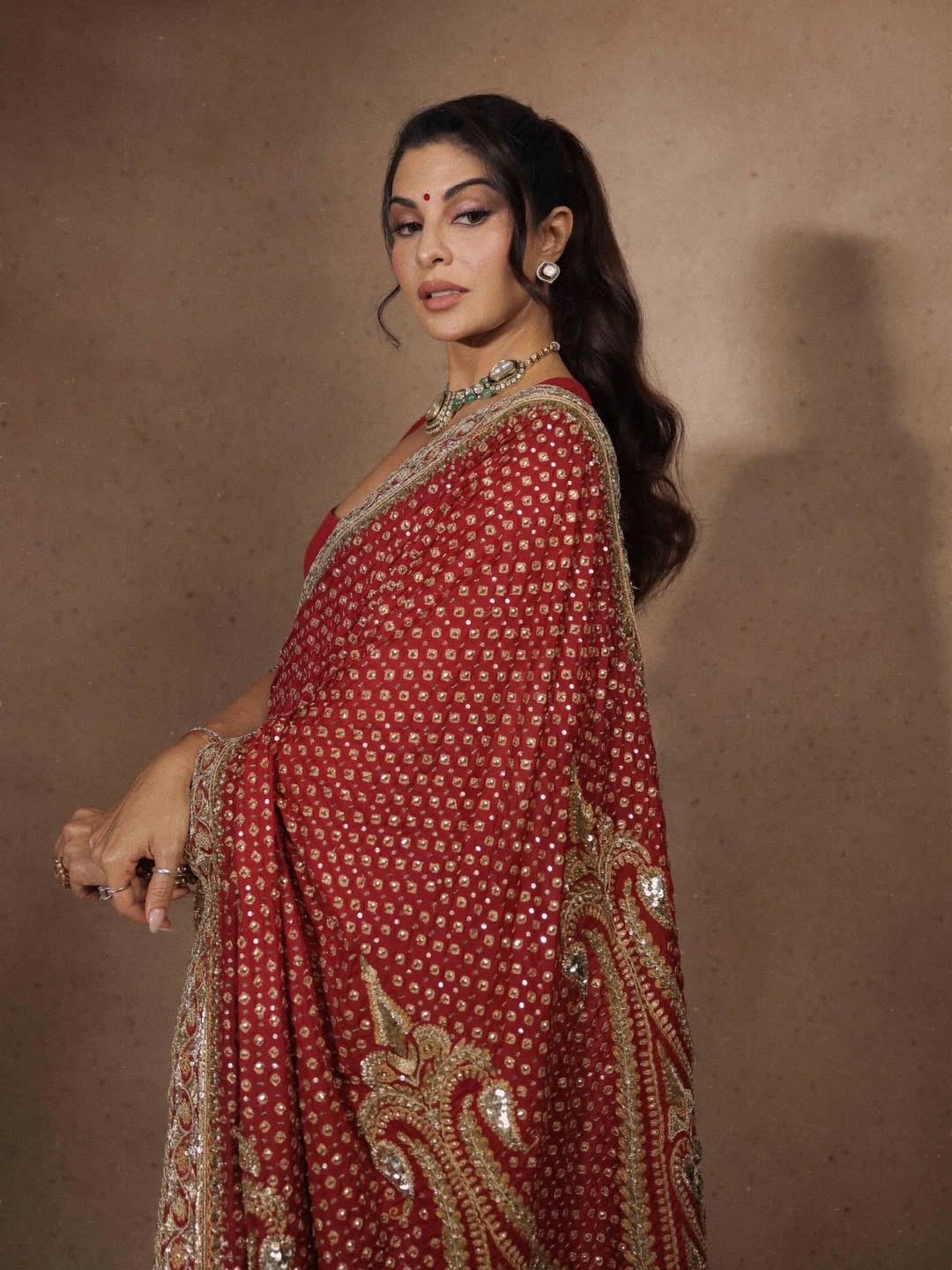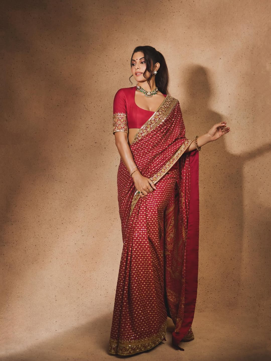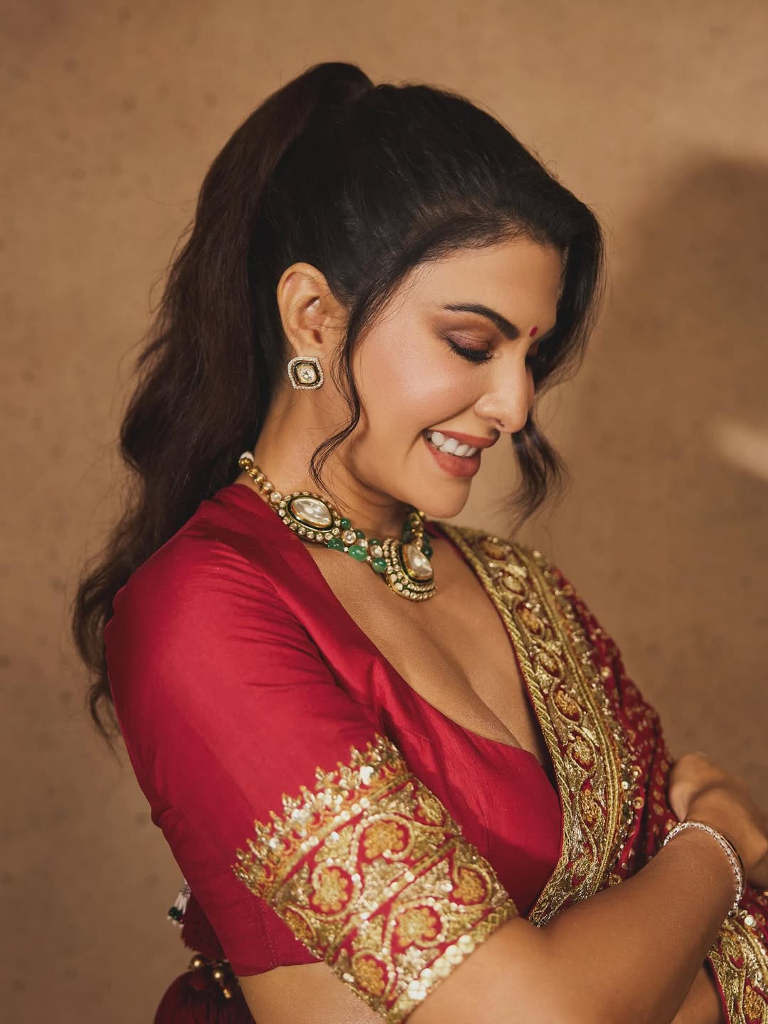 In the photo, Jacqueline is dressed in a royal red saree with detailed mirror and zari work. Her minimal yet classy jewellery a green-stoned choker necklace, matching earrings, and bangles. Her hair was tied in a neat ponytail.