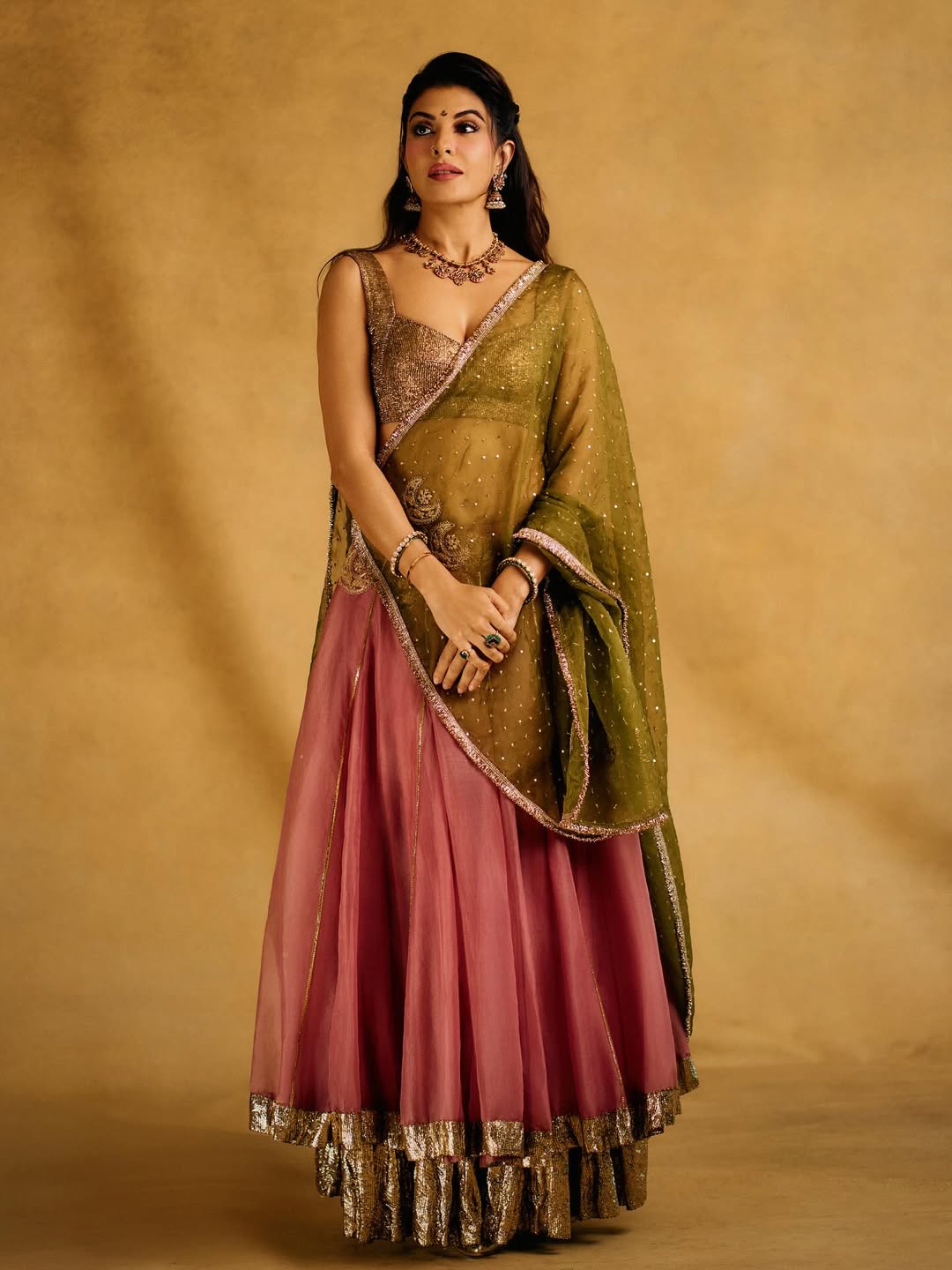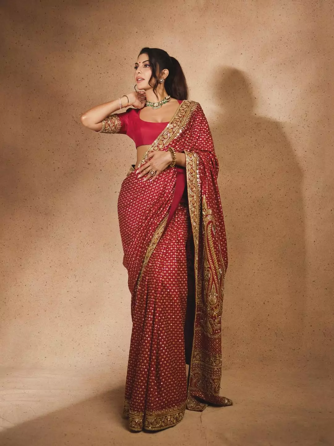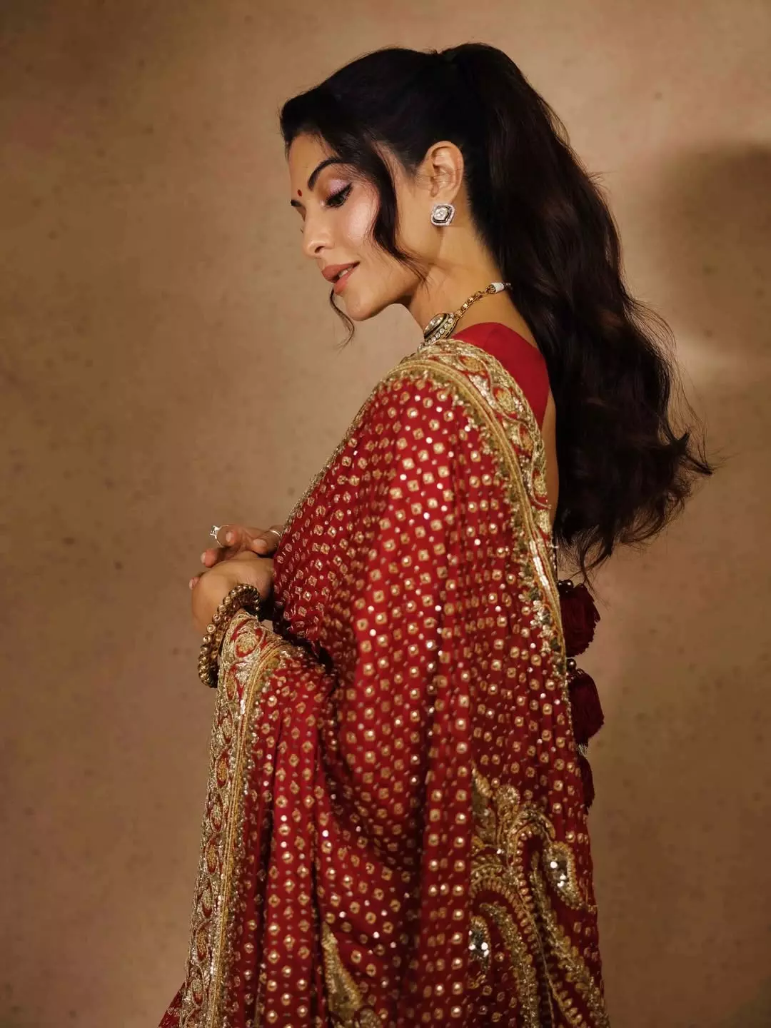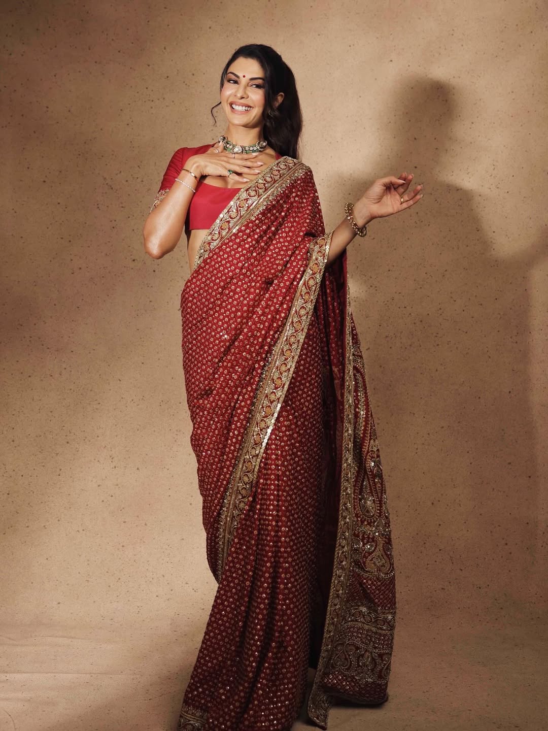 In the photo, Jacqueline is dressed in a royal red saree with detailed mirror and zari work. Her minimal yet classy jewellery a green-stoned choker necklace, matching earrings, and bangles. Her hair was tied in a neat ponytail.