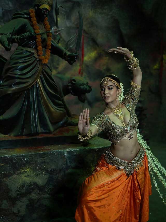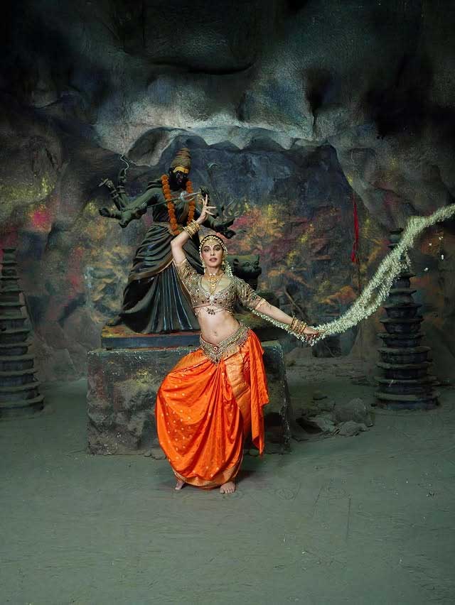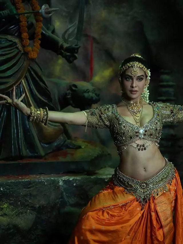 The choreography, led by Shazia and Piyush, highlights Jacqueline performing intricate Indian classical dance movements. Her elegance and grace are evident as she exudes confidence throughout the routine. Jacqueline’s attire is a visual treat a traditional classical dance costume featuring an embellished golden blouse adorned with gemstones. She completes her look with a silk saree, elegantly unfolding with each leg movement.