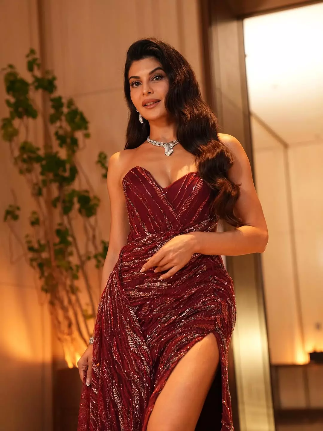 By: Priya Chowdhary Nuthalapti | 30 Sept 2025 9:52 AM ISTJacqueline Fernandez in her new picture is seen in a shimmering maroon gown with a stylish slit. She completed her look with a silver necklace and earrings.