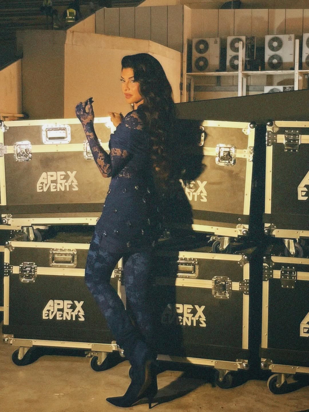Her lace outfit wrapped around her like it was tailored directly onto her skin, sculpting her silhouette with effortless perfection. The matching knee-high boots added a bold punch of drama, while the off-shoulder wrap brought a soft, flirty charm. Tiny gold accents on the skirt shimmered under the lights, catching every eye each time she moved.