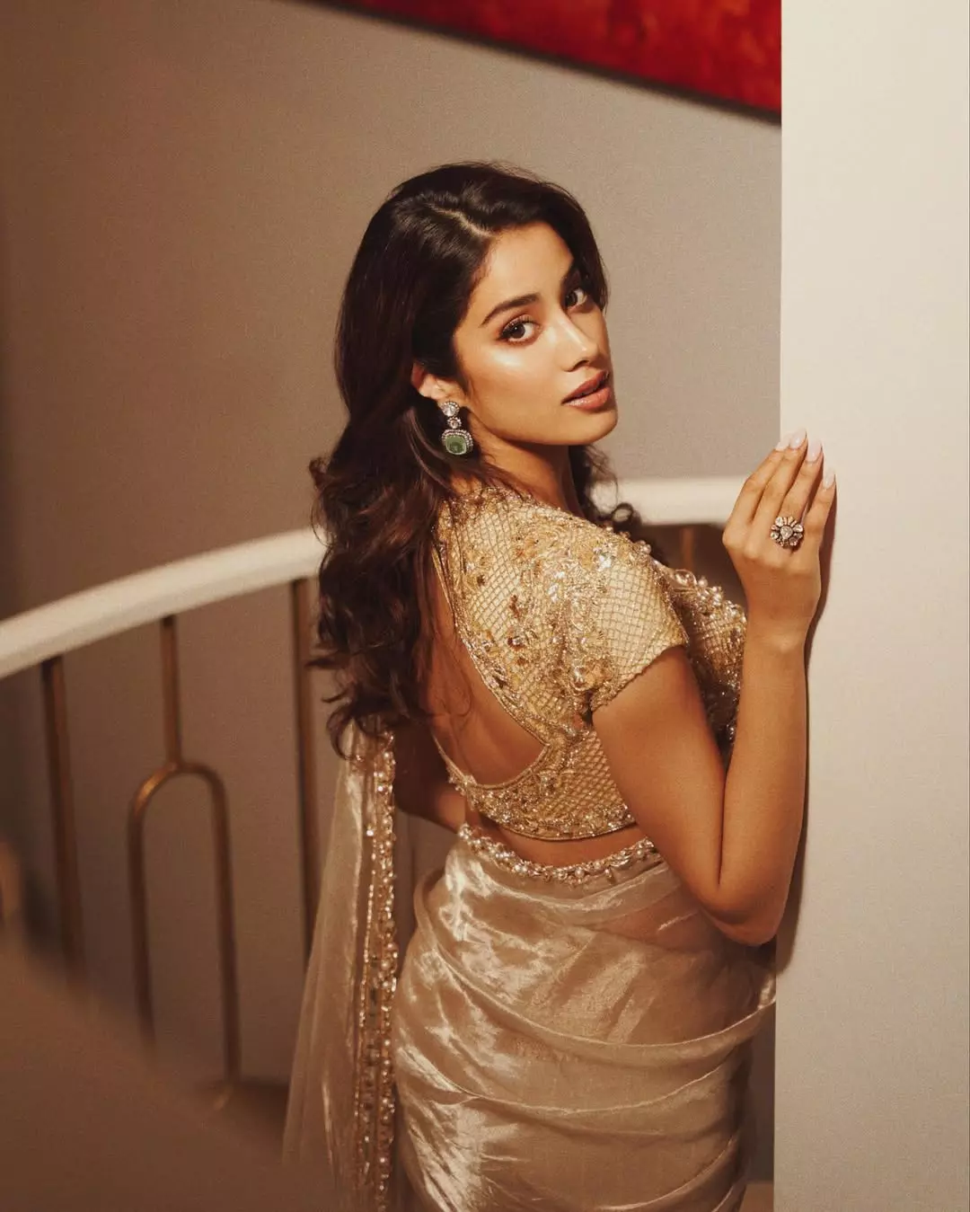 Leaving no stone unturned for the film’s promotions, Janhvi embraced a South Indian-inspired saree style to match her character in the movie, and she nailed it. She paired the drape with a sleeveless blouse featuring a deep sweetheart neckline. The subtle sequins along the edges caught the light softly, without making the outfit too flashy. The pallu was kept simple and clean, allowing the saree's soft details to shine. For accessories, she chose gold earrings with pearl drops, a narrow bangle, and a simple ring. Her hair was loosely waved in a side part, giving a relaxed look. Her makeup was gentle, lined eyes with kohl, a soft pink lipstick, and a light blush on her cheeks. The overall look was easy yet eye-catching, mixing the elegance of tradition with the comfort of modern style, making it ideal for a day of film promotions.
