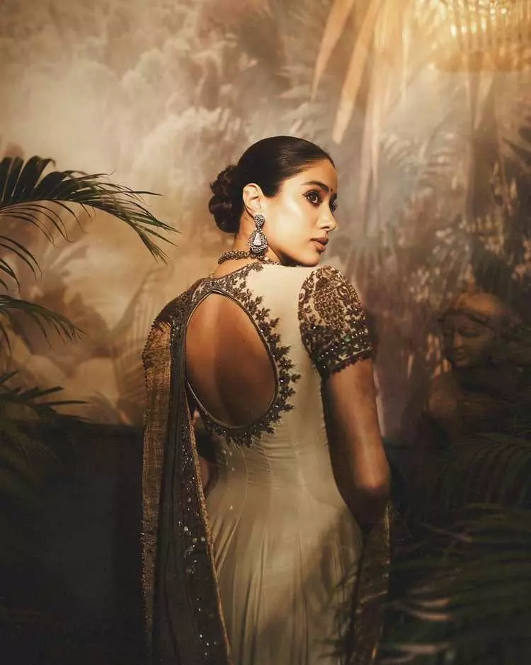 Janhvi Kapoor shared a new picture on her Instagram profile and the photo shows her in a rich, classic and regal traditional dress. The frame looks artistic, with plants, soft lighting.