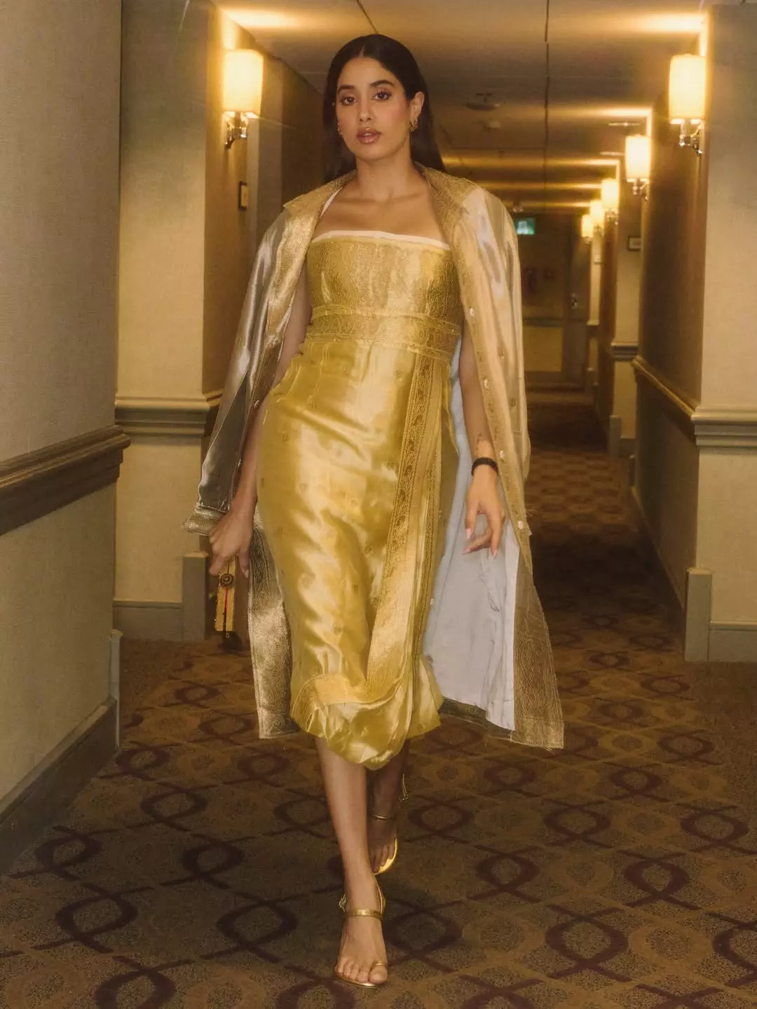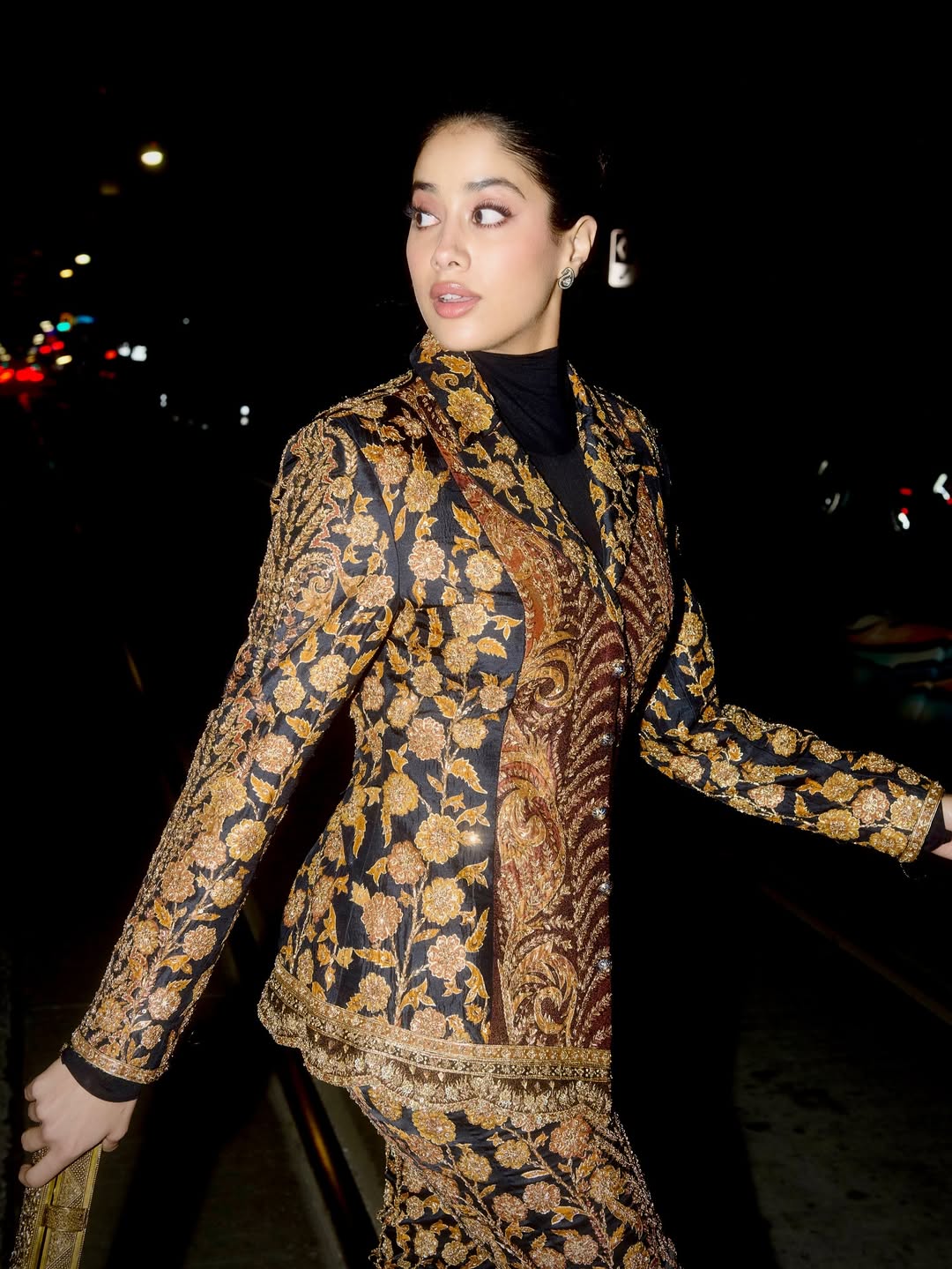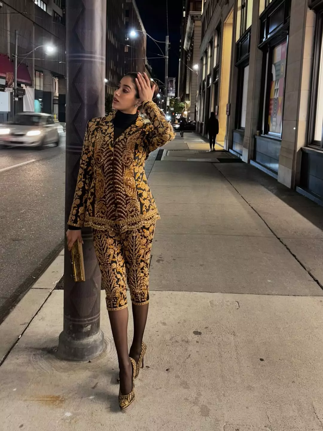 By: Priya Chowdhary Nuthalapti | 13 Sept 2025 12:46 PM ISTJanhvi Kapoor has once again proven her status as a fashion icon with her latest look at the Toronto International Film Festival (TIFF) after-party. A photo shared on Instagram shows Janhvi wearing an eye-catching custom couture outfit designed by Ritu Kumar. The dress included intricate earrings and buttons by Amrapali Jewels, custom shoes by House of Toramally, a classic watch by Art n D antiques and a stylish bag by Meera Mahadevia.
