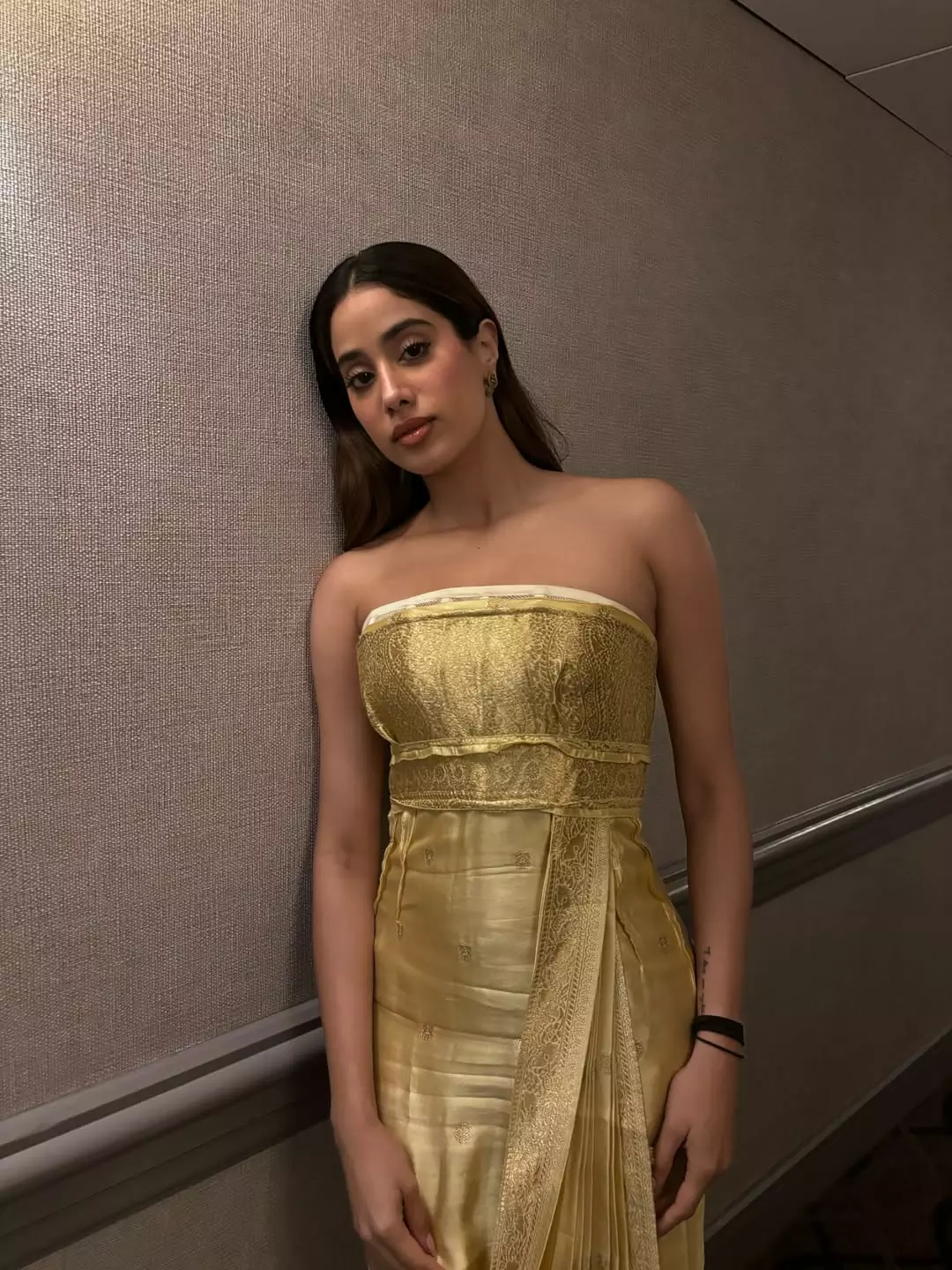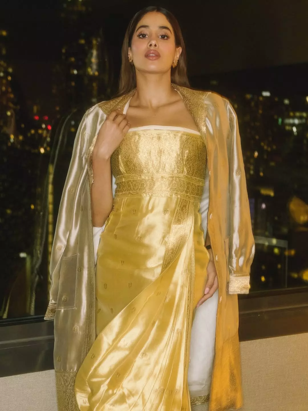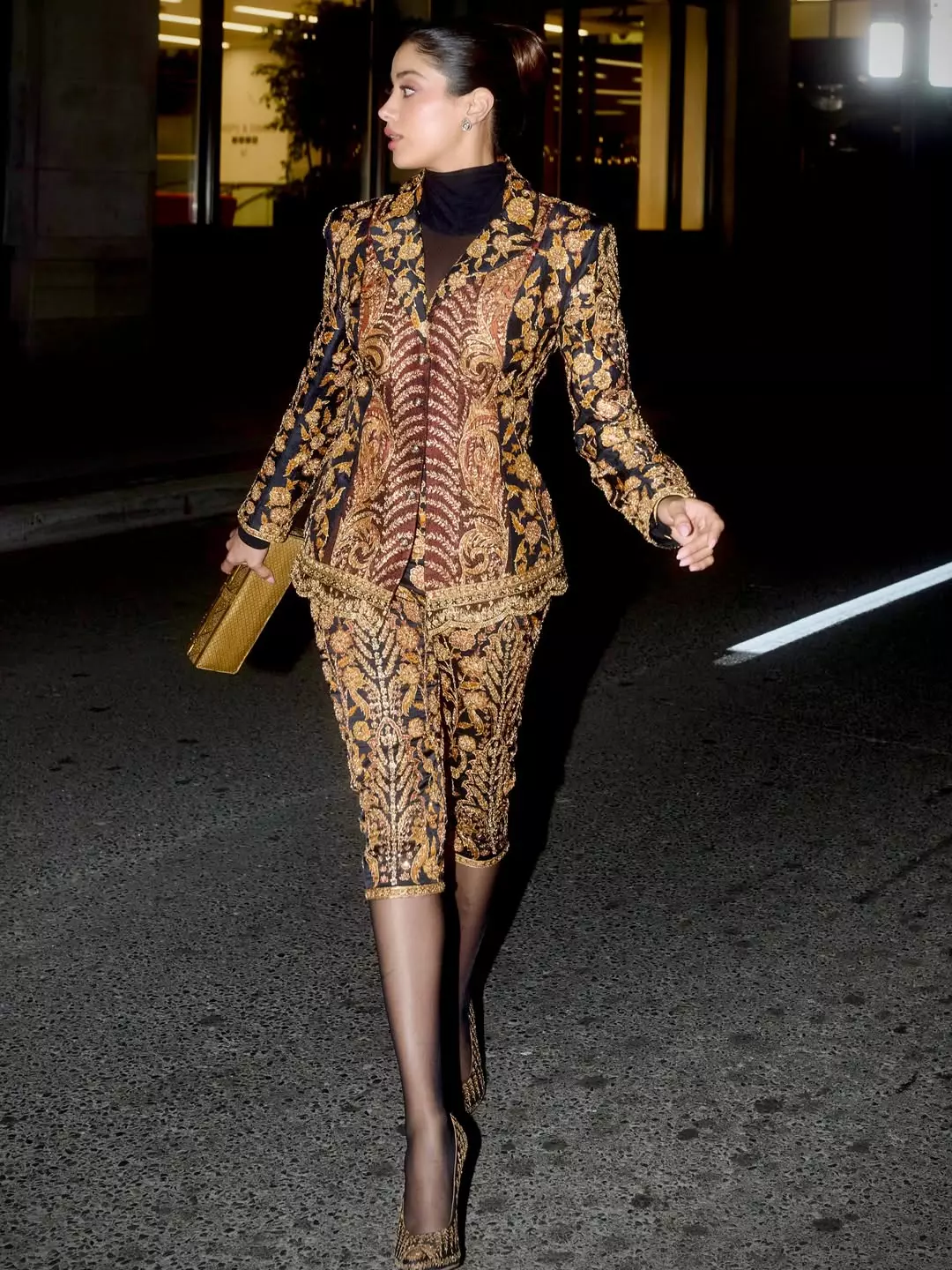 By: Priya Chowdhary Nuthalapti | 13 Sept 2025 12:46 PM ISTJanhvi Kapoor has once again proven her status as a fashion icon with her latest look at the Toronto International Film Festival (TIFF) after-party. A photo shared on Instagram shows Janhvi wearing an eye-catching custom couture outfit designed by Ritu Kumar. The dress included intricate earrings and buttons by Amrapali Jewels, custom shoes by House of Toramally, a classic watch by Art n D antiques and a stylish bag by Meera Mahadevia.