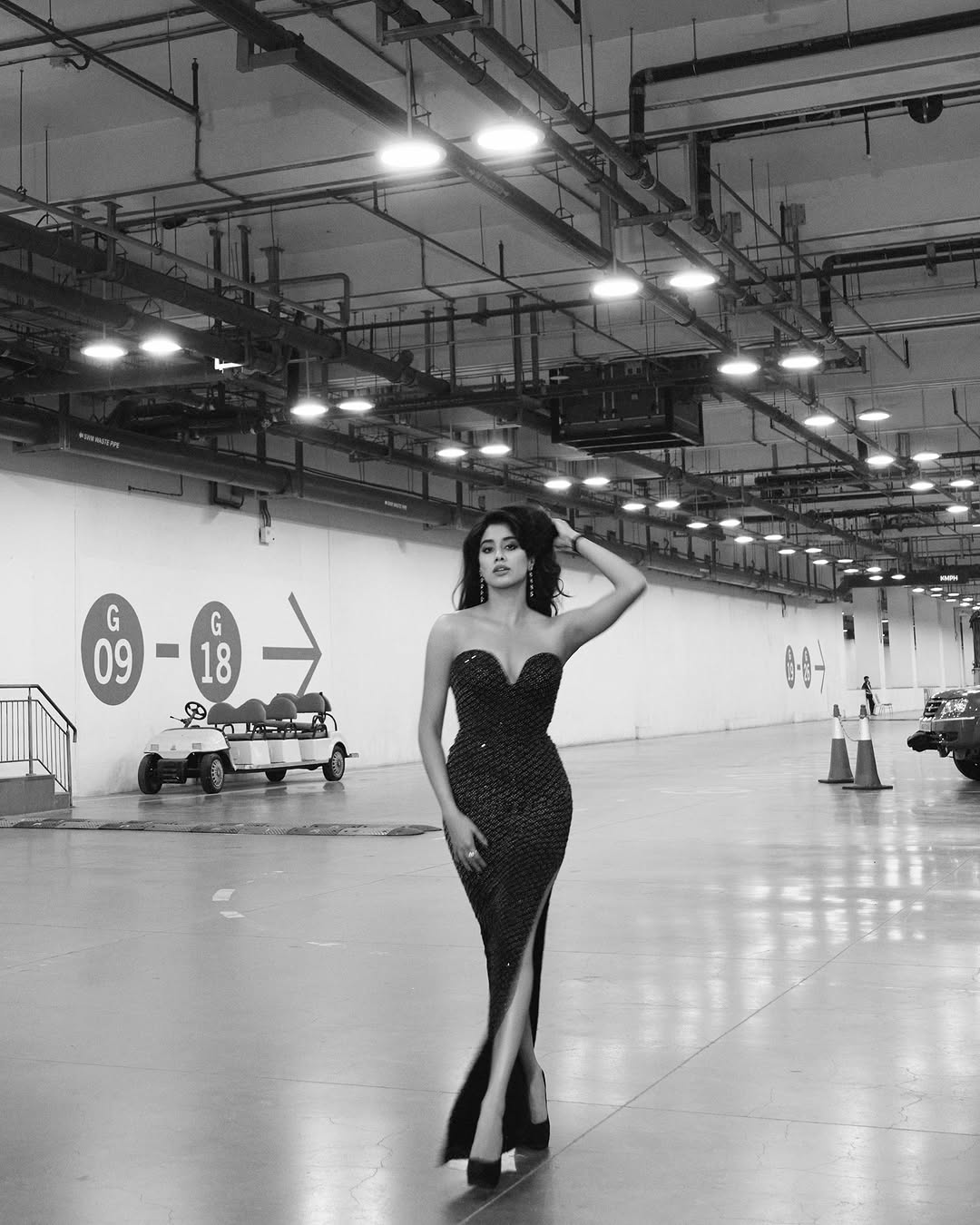 The actress dazzled in a strapless black gown that combined traditional Indian craftsmanship with modern elegance. The dress crafted from Bandhani fabric has intricate details and a contemporary silhouette. A thigh-high slit added glamour while the plunging neckline enhanced the sophisticated appeal.