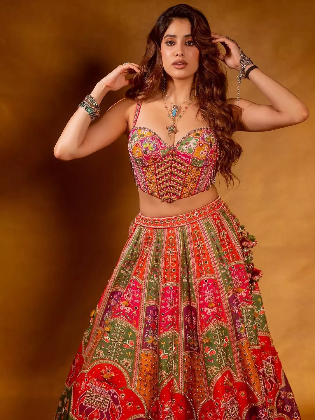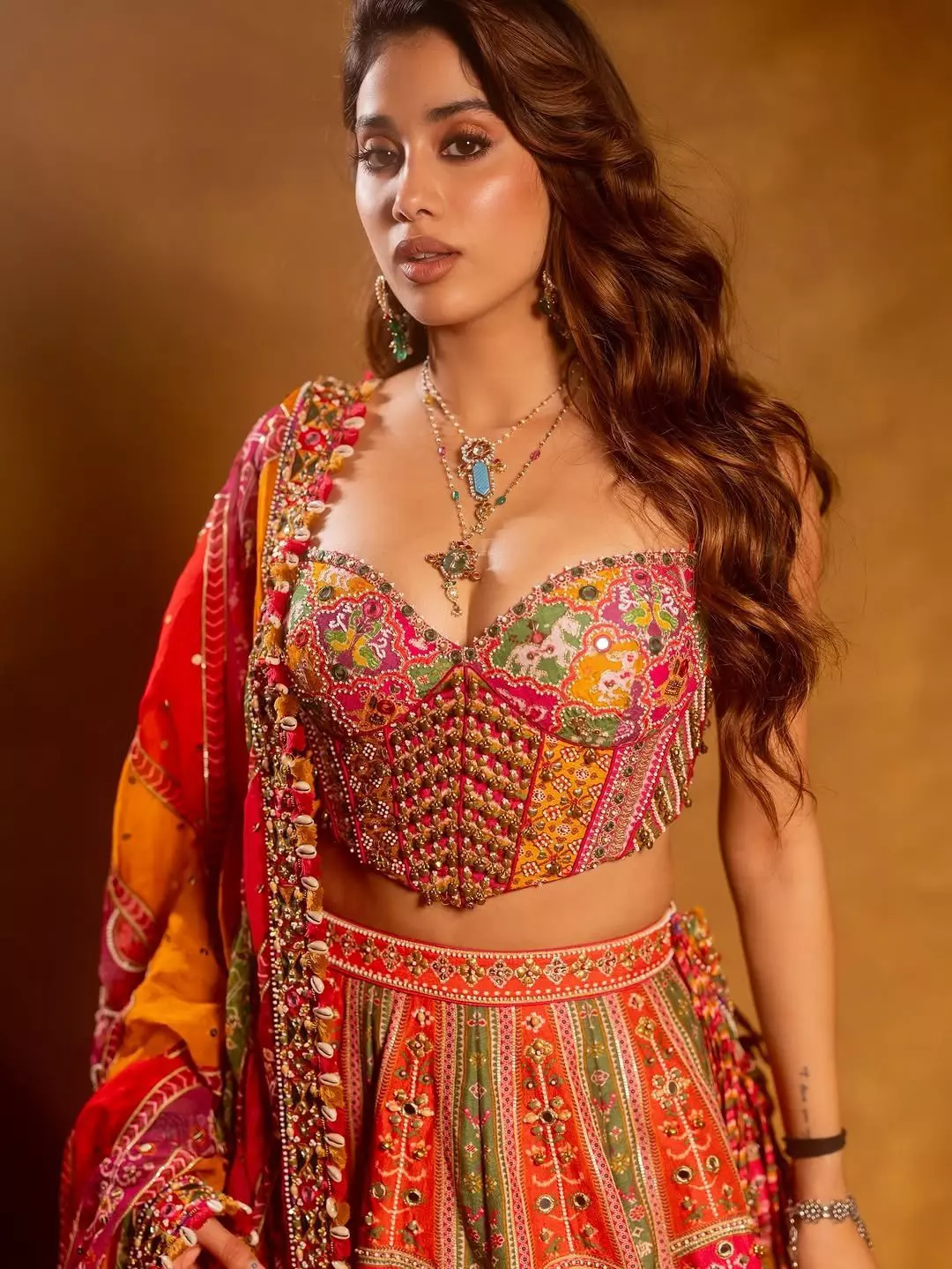 Janhvi Kapoor continues to dazzle with her bold fashion choices, and her latest look is a stunning celebration of Indian craftsmanship. Dressed in a vibrant, mirror-work embroidered lehenga choli, the actress embraced the festive spirit with grace and glamour. The colorful outfit featured intricate threadwork, rich embellishments, and a corset-style blouse that accentuated her silhouette while blending traditional and contemporary design elements.
