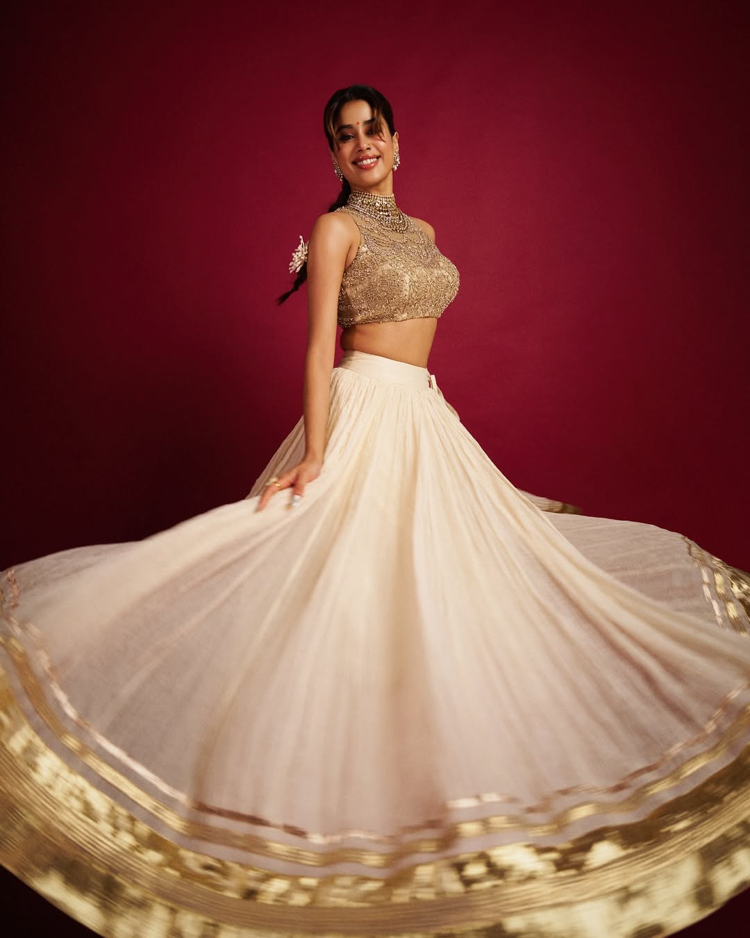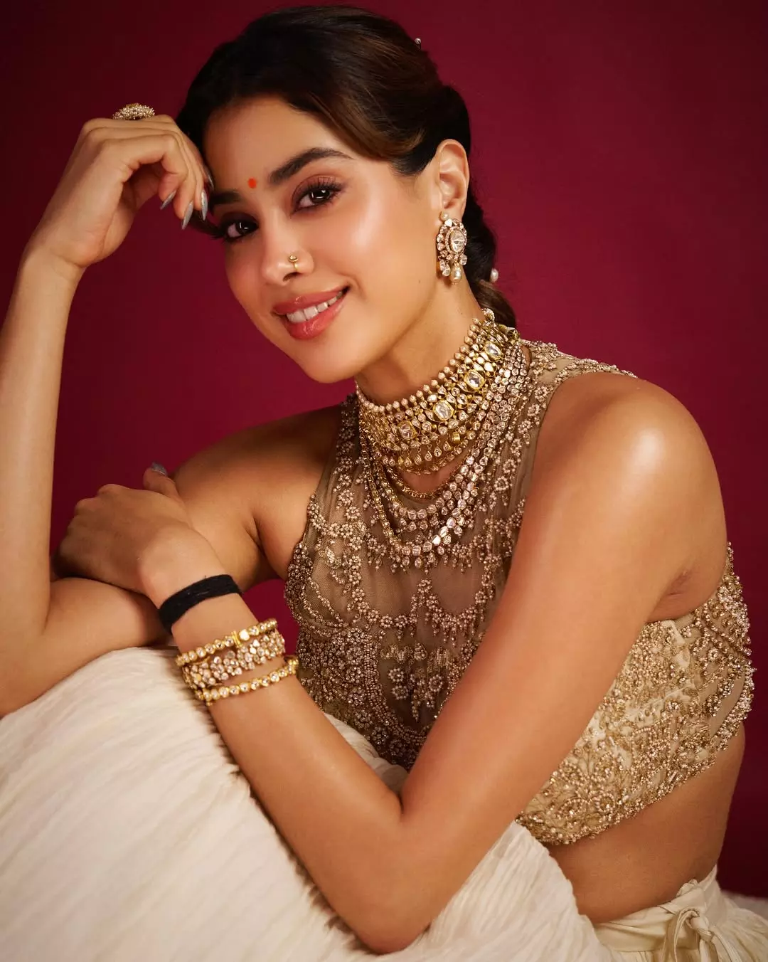 Janhvi Kapoor posted a new picture on Instagram. She looked graceful in her latest traditional look and sat against a maroon backdrop that made her style stand out. Her dress had golden detail with a flowing white base. She paired it with heavy jewelry and simple makeup.