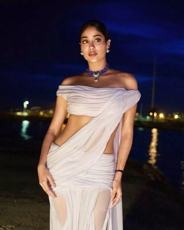 She walked along the beach in a white fusion saree designed by the brand Di Petsa. This was not a regular saree it had a unique wet-look effect. The fabric was soft and flowy, perfectly hugging her figure. The saree looked almost like it was dripping with water, giving it a magical and dramatic feel. The dress included an off-shoulder blouse.