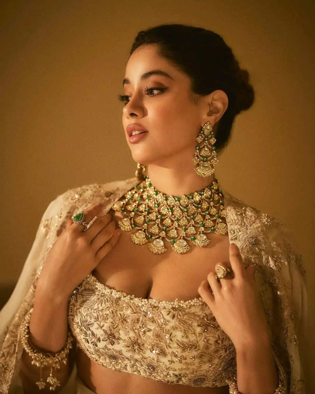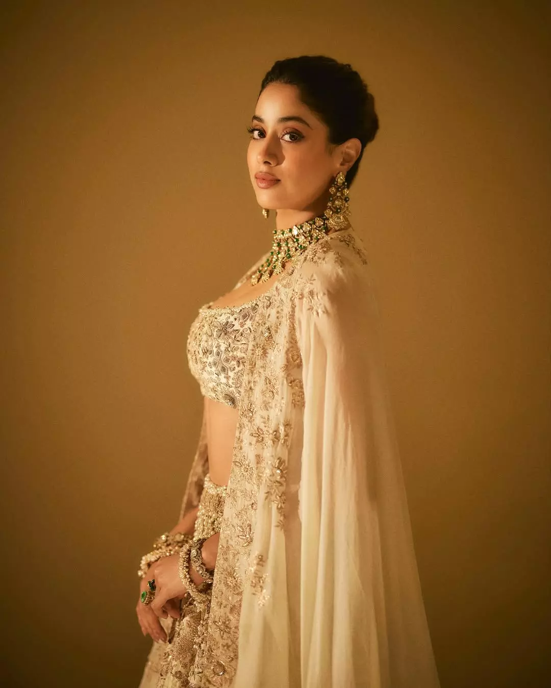 actress janhvi kapoor looks ethereal in this regal ivory lehenga, radiating classic indian grace with a modern touch. the heavily embroidered blouse paired with a flowing dupatta captures royal sophistication, while her statement jewelry and minimal makeup complete the divine look. every detail — from the intricate work to her poised expression — reflects elegance, tradition, and confidence. 💫