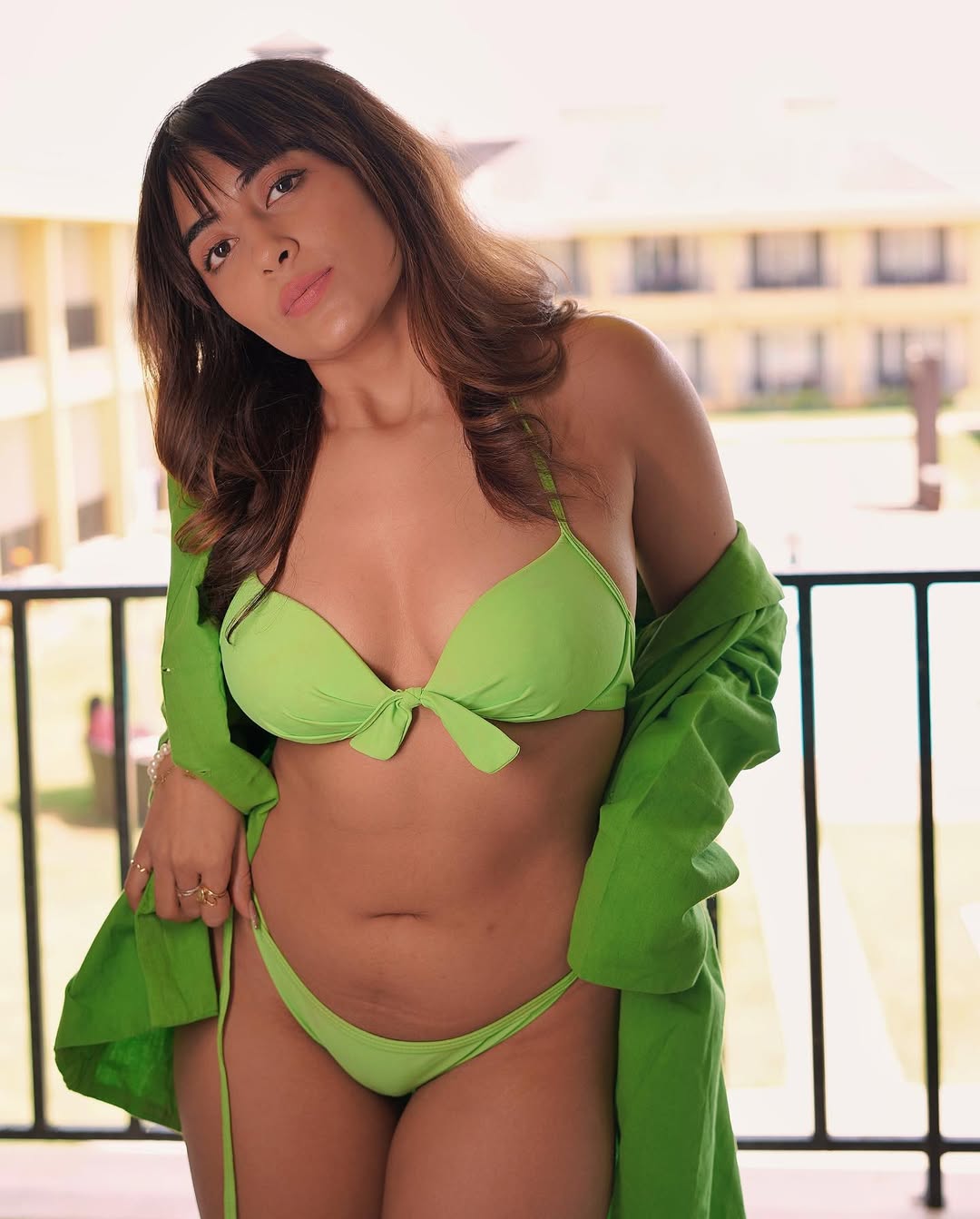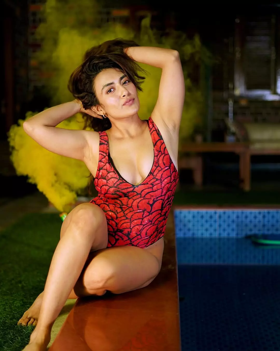 Jinal Joshi captivated fans with her latest sizzling photoshoot, lounging poolside in a striking red-and-black halter-neck bikini that accentuated her curves and confidence. Seated cross-legged on the tiled edge, with tousled dark hair framing her face, she gazed upward with a mix of intrigue and allure, the warm sunlight highlighting her glowing skin, subtle makeup, and elegant gold jewelry including a pearl bracelet and layered necklace. The vibrant setting against the rustic backdrop added a sultry, relaxed vibe to her bold and empowering look.