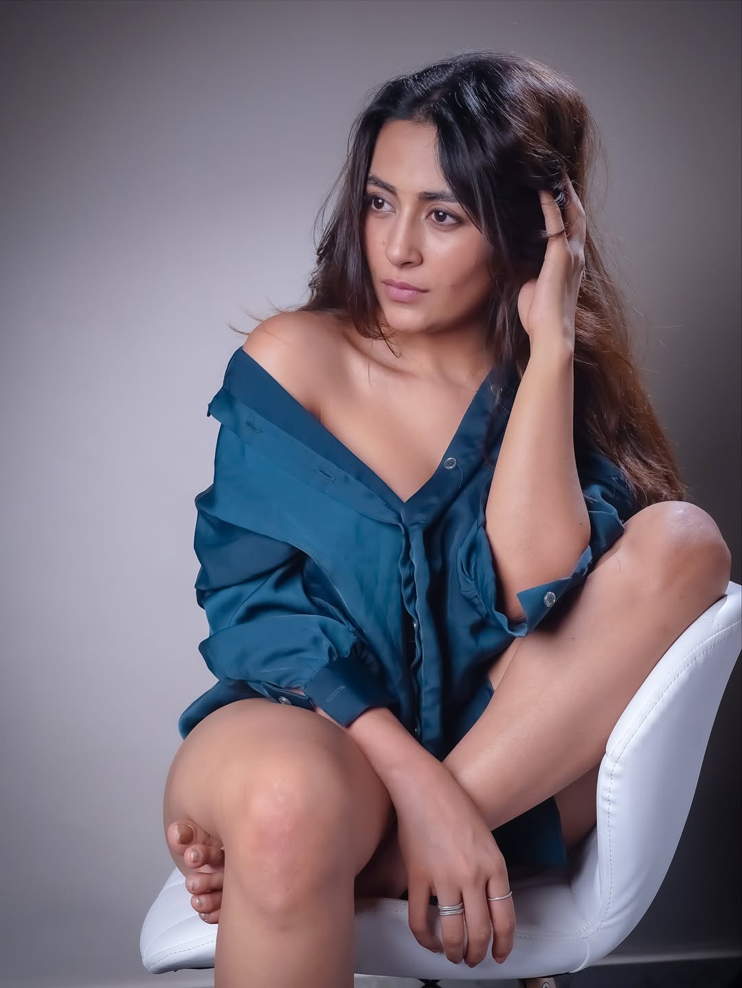 The candid energy of the shoot highlights her fearless approach to style and self-expression. With tousled hair, soft makeup, and a relaxed yet powerful stance, Jinal captures the essence of modern glamour. The interplay of light and shadow enhances her features, while the slightly undone shirt adds a spontaneous, storytelling element to the portrait.