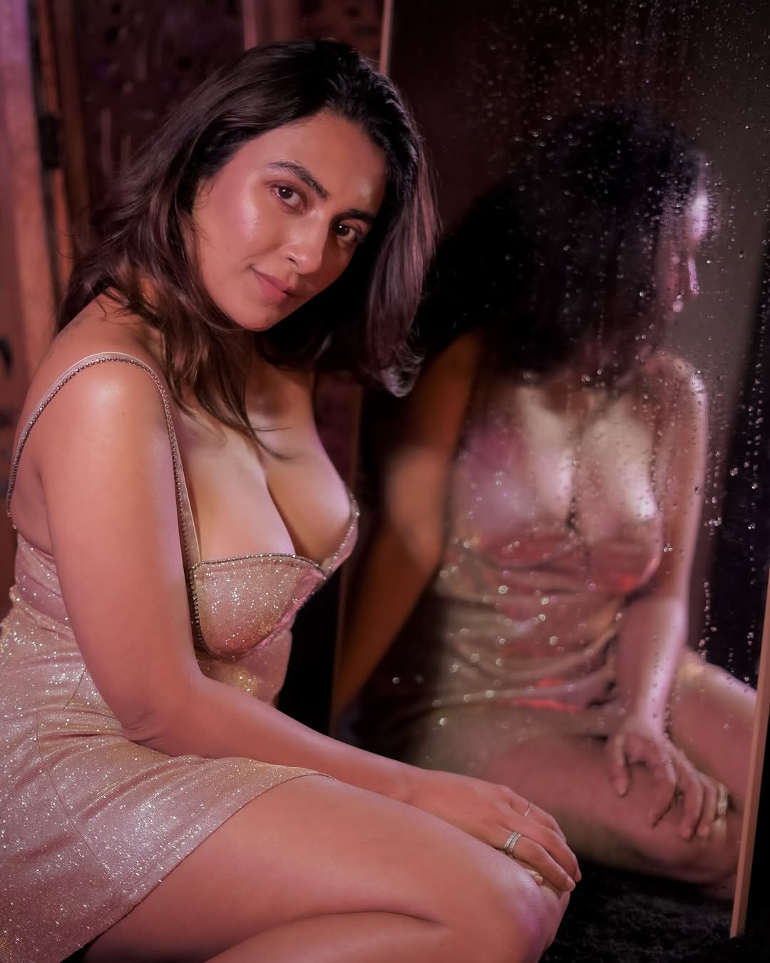 Jinal Joshi, the Mumbai-born actress and model (July 7, 1997), continues to captivate with her bold confidence and magnetic screen presence. In a recent glamorous photoshoot, she stuns in a shimmering rose-gold sequined strapless mini dress that hugs her curves, sparkling under dramatic purple lighting. With long wavy hair, dewy makeup, and a poised, seductive gaze reflected in a mirror, she exudes effortless allure in this intimate, moody setting—perfectly showcasing her blend of sensuality and sophistication.
