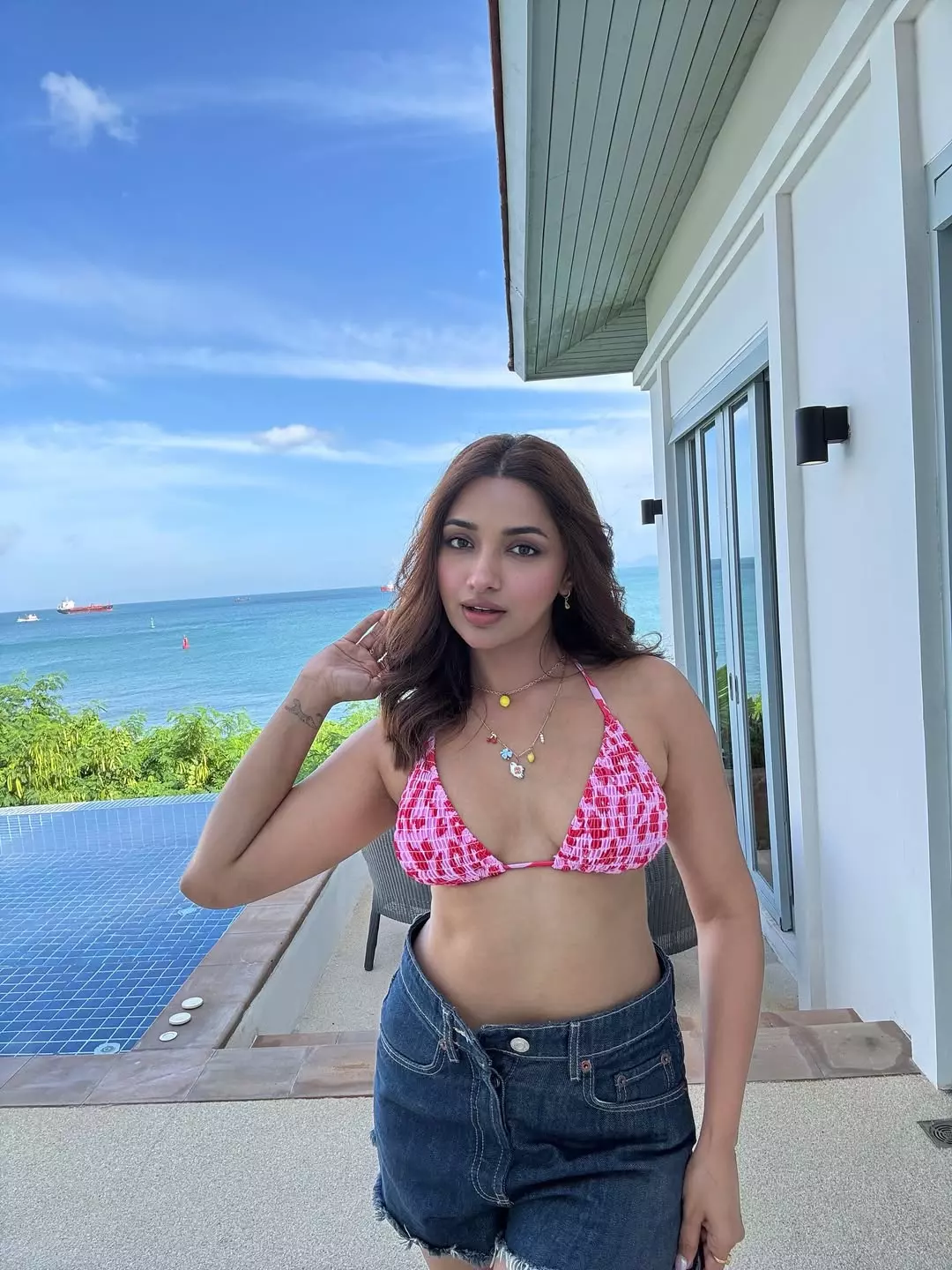 Jiya Shankar recently posted a picture on Instagram in which she is seen in a pink and white bikini paired with denim shorts.