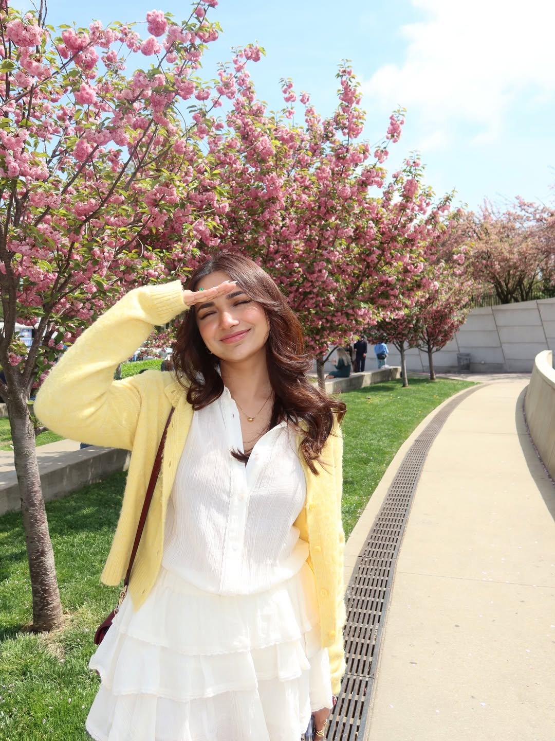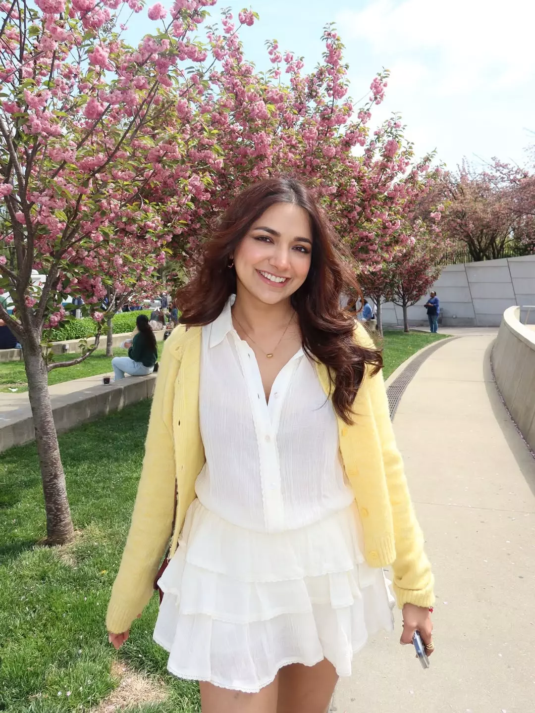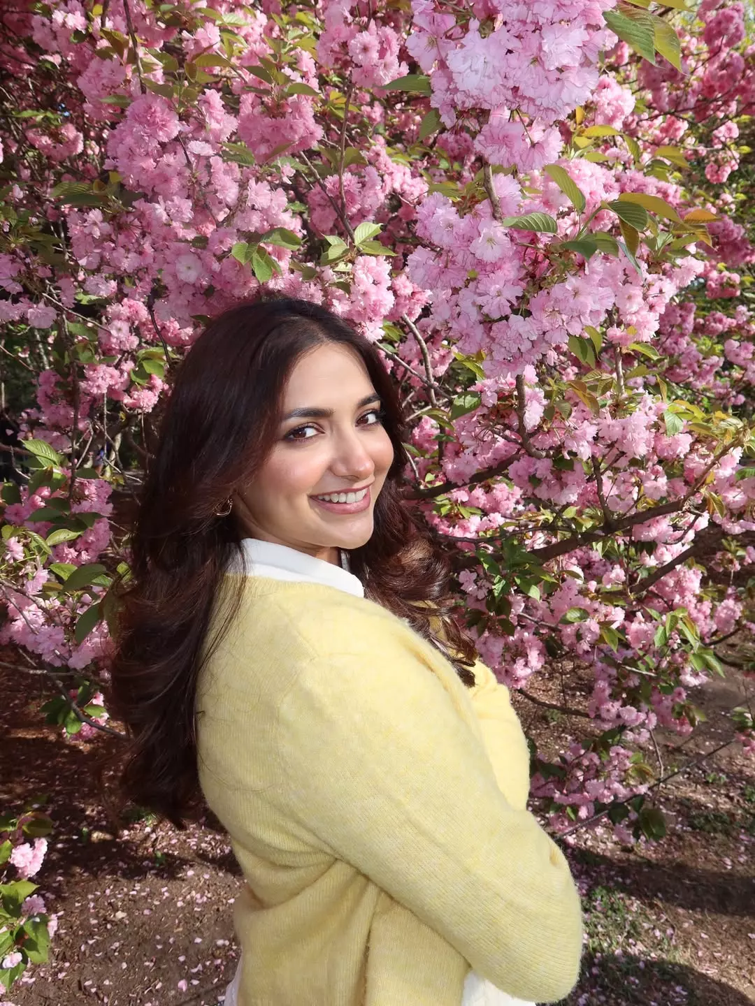 Jiyaa Shankar beams with radiant energy in this beautiful outdoor photograph, standing gracefully amid blooming pink cherry blossom trees. Dressed in a charming layered white mini dress paired with a soft yellow cardigan, she carries a fresh, cheerful vibe that perfectly reflects her vibrant personality and screen-friendly smile.