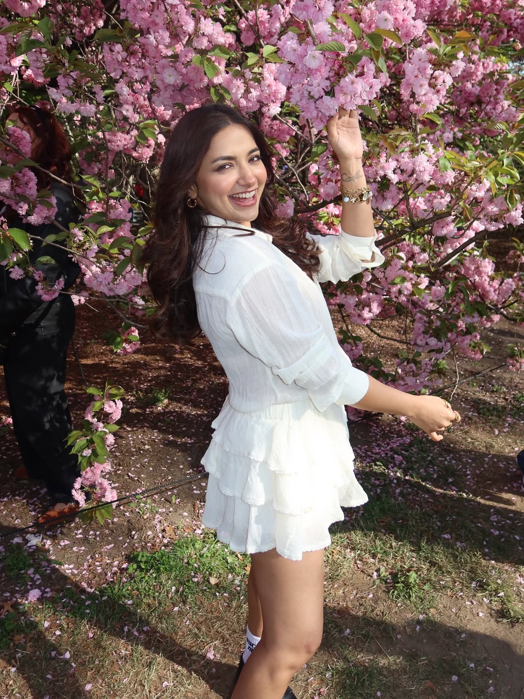 Jiyaa Shankar Stuns in Fresh White Dress Under Pink Blossoms