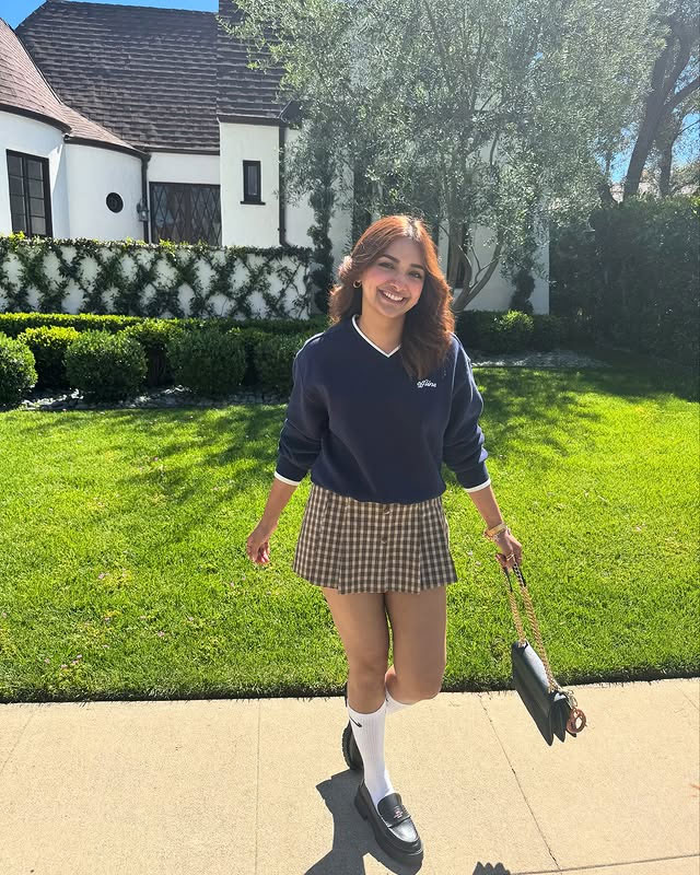 In her recent picture, she wore a navy blue sweater and a brown checkered skirt. She completed the look with white socks and black shoes.