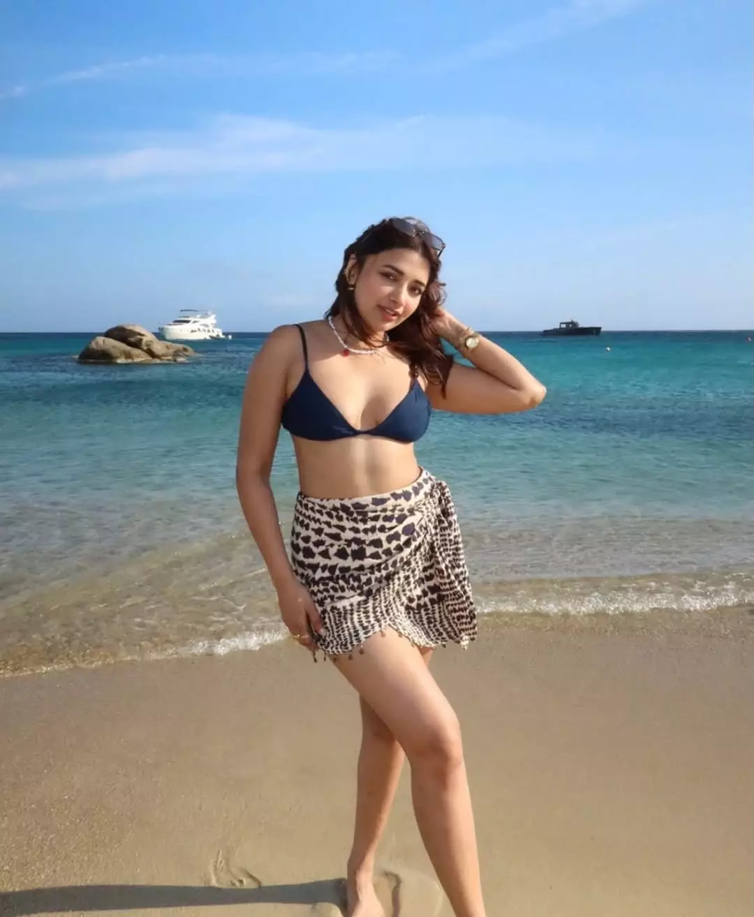 The photo shows Jiya relaxing at a beachside location, seated on a sunbed with large umbrellas behind her. She is seen wearing a navy-blue bikini top paired with a printed skirt, accessorised with a necklace and sunglasses in hand.