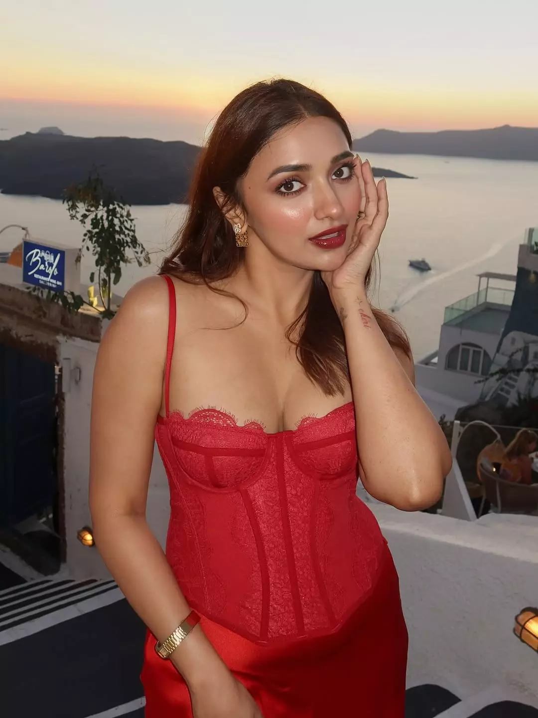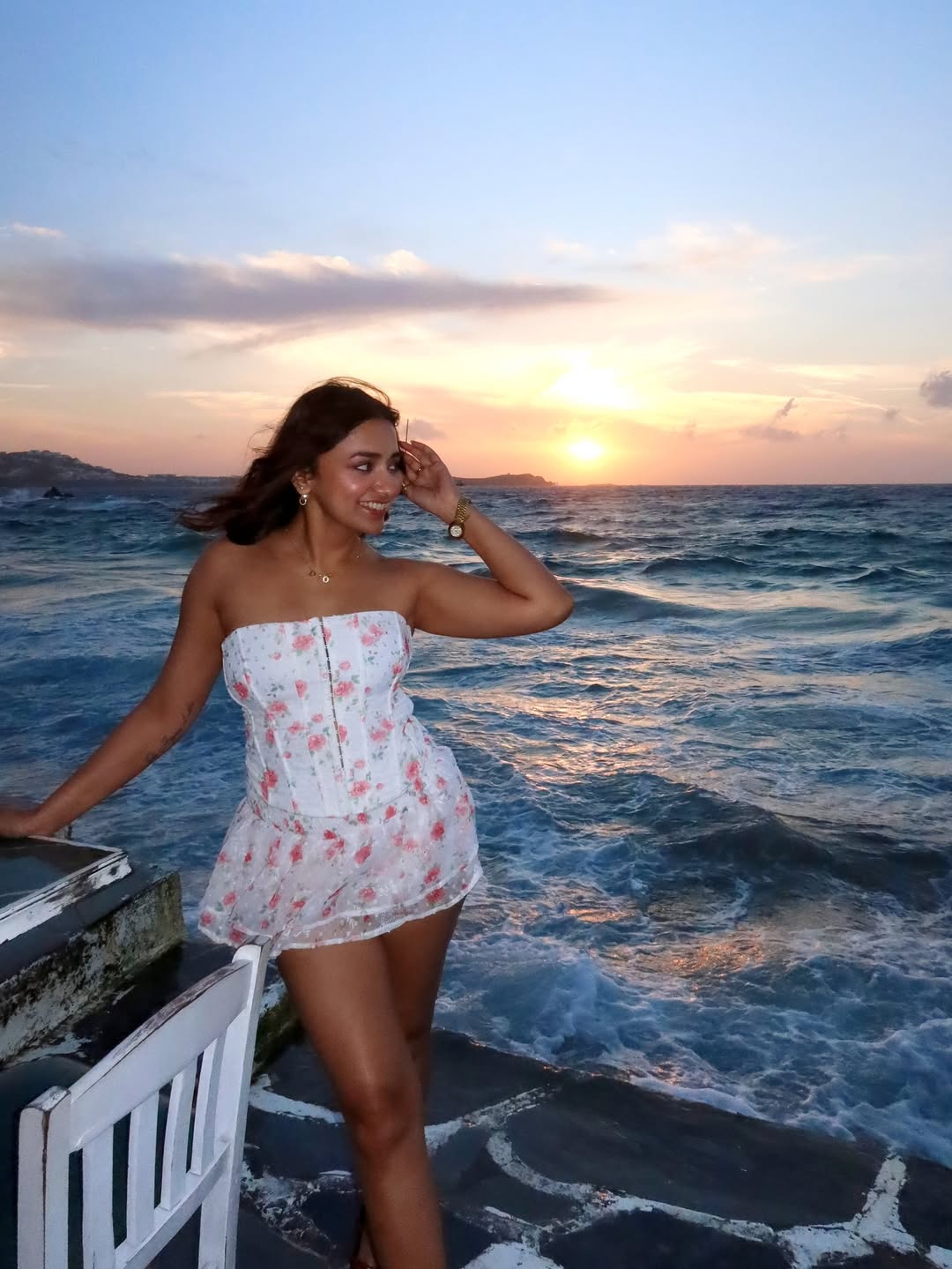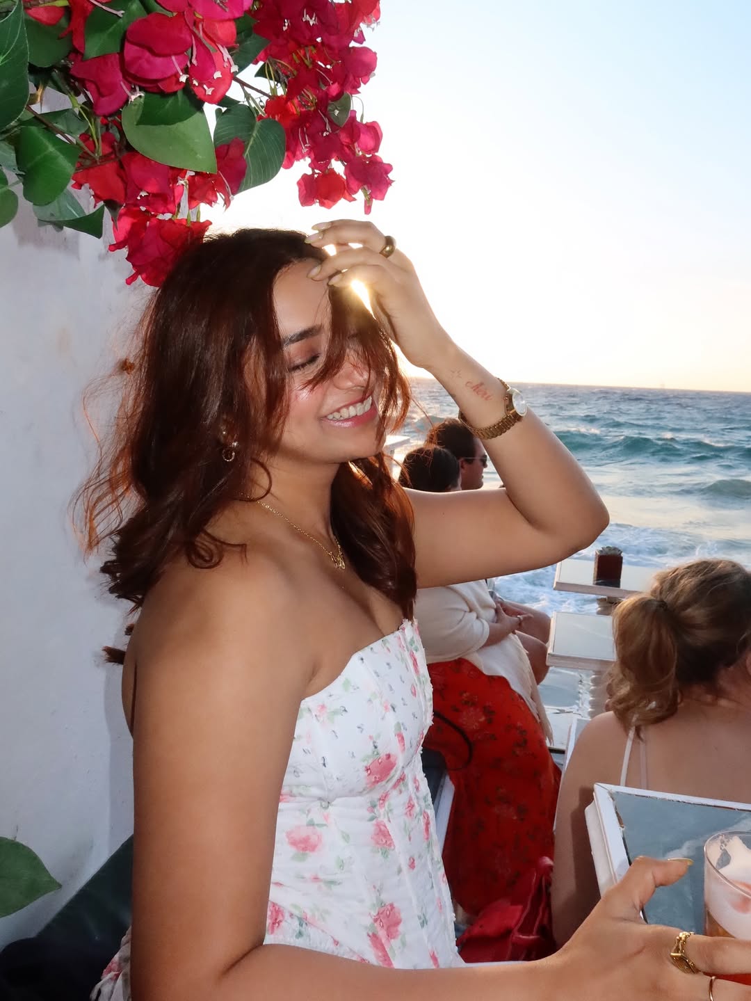 Enjoying a refreshing drink and surrounded by vibrant bougainvillea blooms, Jiyaa’s infectious smile became the highlight of the evening. The picturesque backdrop of the sea waves and soft golden sky made the moment even more magical, creating a frame that radiates joy and positivity.