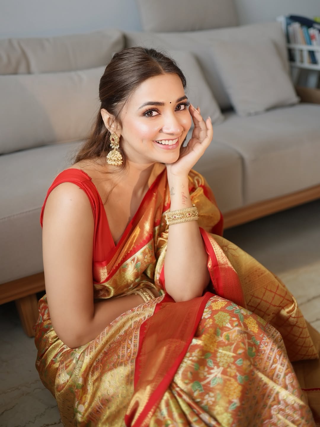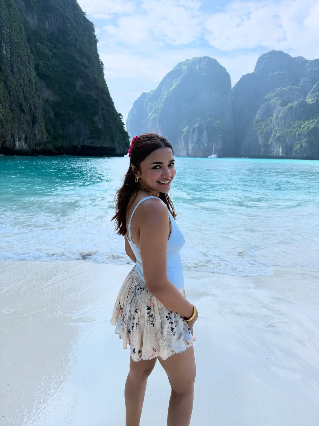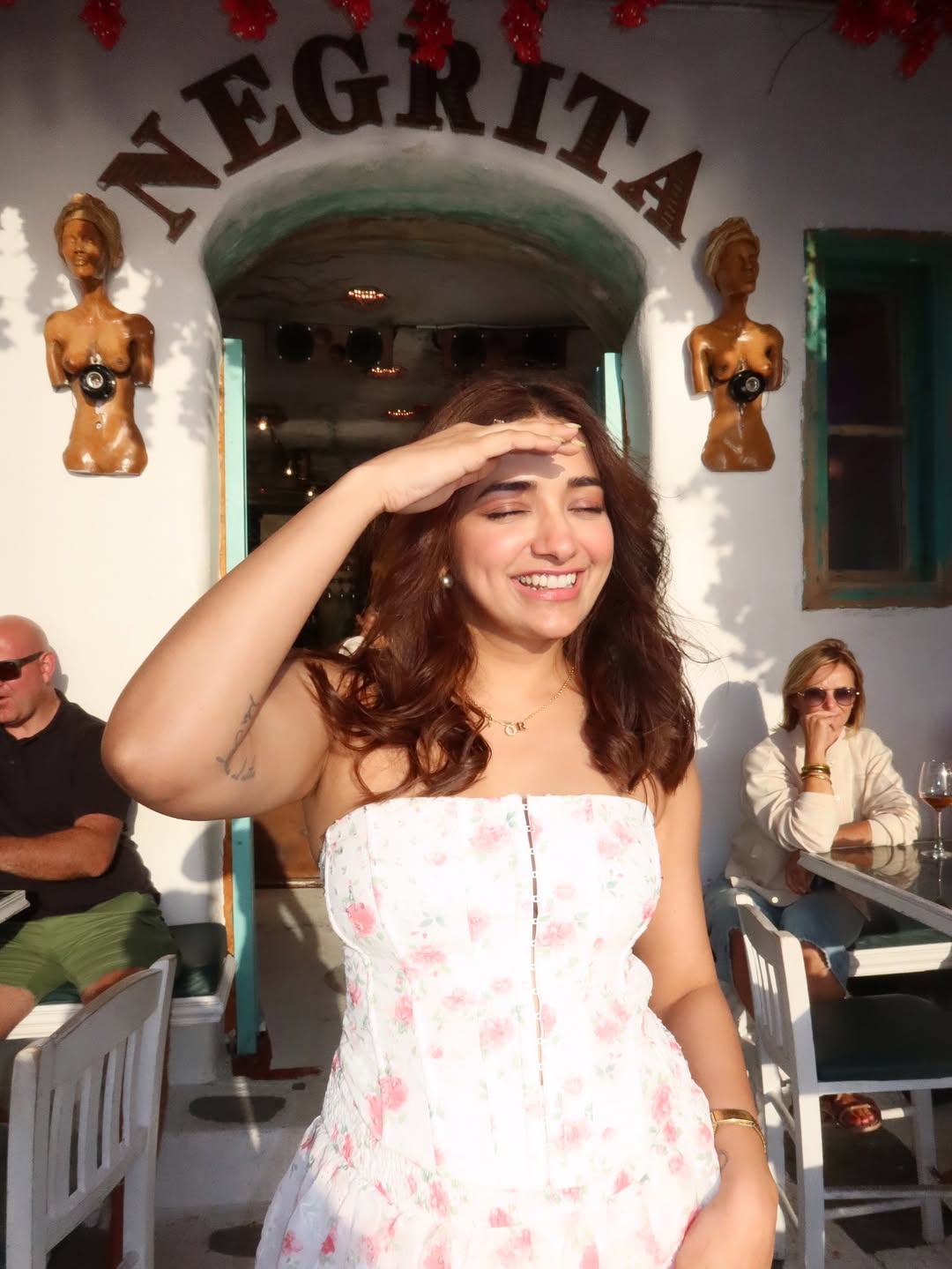 Dressed in a delicate white floral strapless dress, Jiyaa looked like a vision of summer freshness. The pastel blooms on her outfit perfectly reflected the breezy, romantic vibe of the setting. Her glowing skin and minimal makeup highlighted her natural beauty, while her loose, wavy hair added a touch of carefree charm to the look.