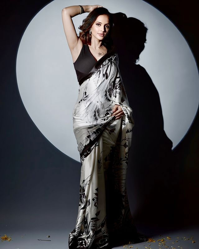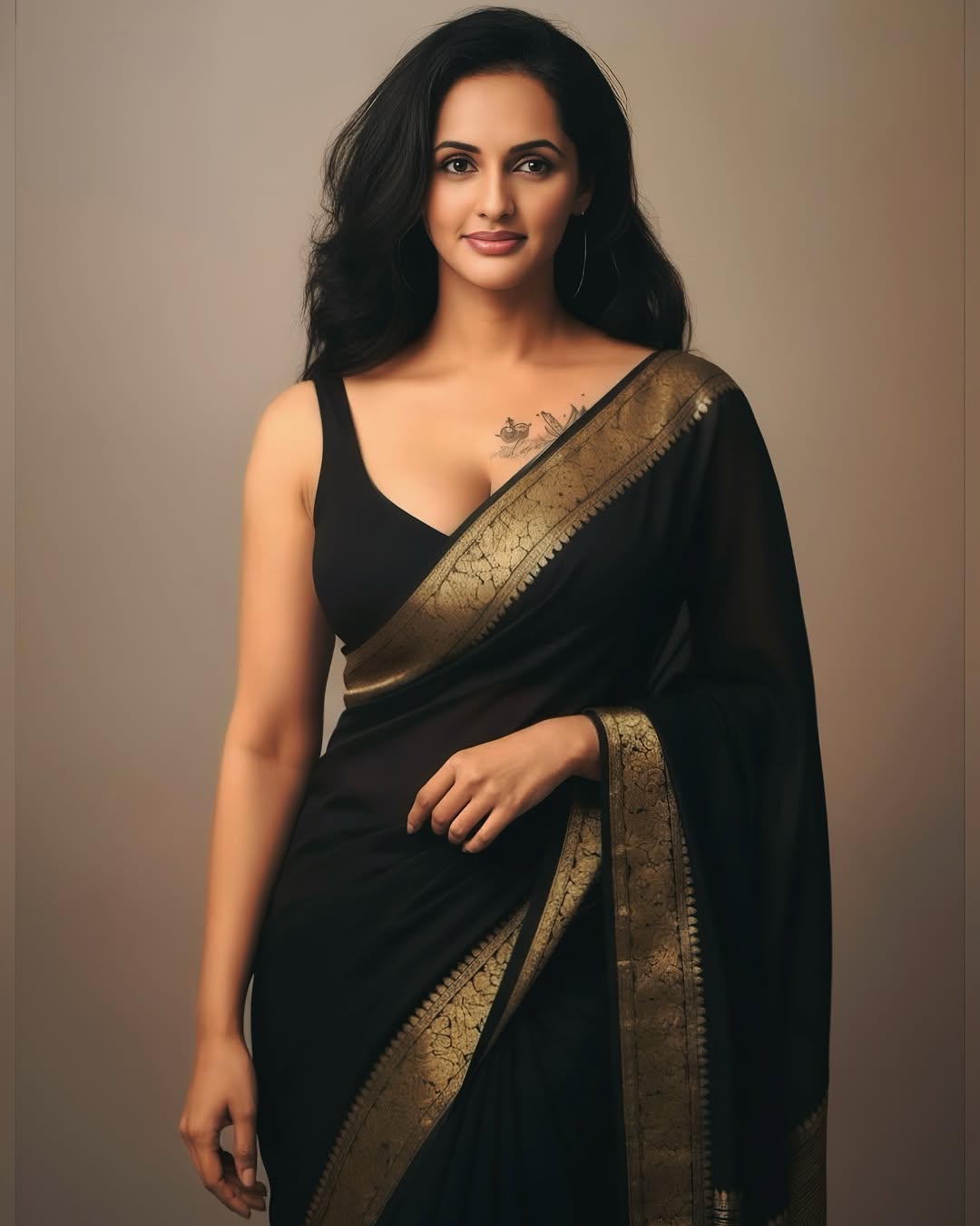 Draped in a vibrant yellow saree with a stylish backless blouse, she exudes effortless elegance as her long hair flows in the breeze.