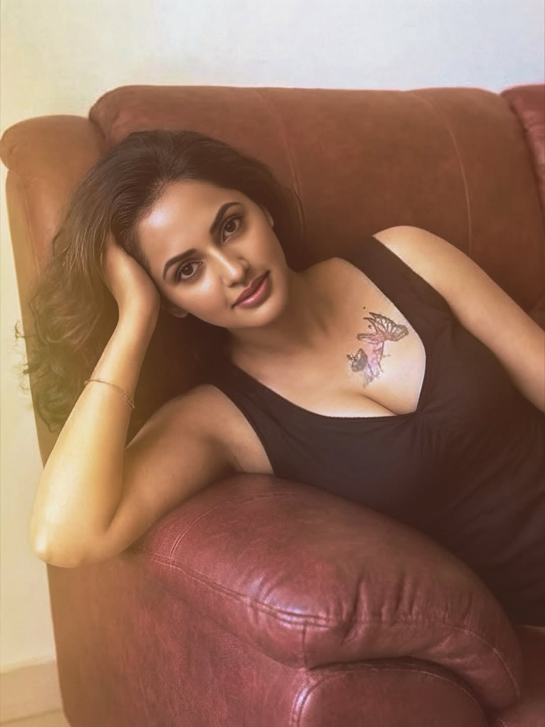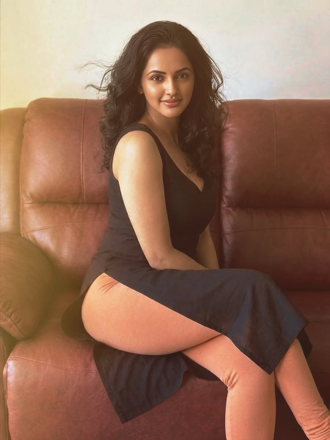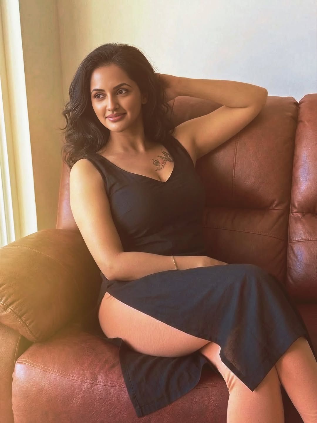 By: Tupaki Gallery Desk | 18 April 2026 4:11 PM ISTIn a warm and sophisticated new portrait, Jyoti Poorvaj (also known as Jyothi Rai or Jyothi Poorvaj) sits gracefully on a leather couch, exuding quiet strength and elegance. Dressed in a sleek black V-neck sleeveless dress that highlights her figure, with one hand gently running through her wavy dark hair and a subtle chest tattoo visible, the actress delivers a poised, captivating gaze under soft golden lighting.