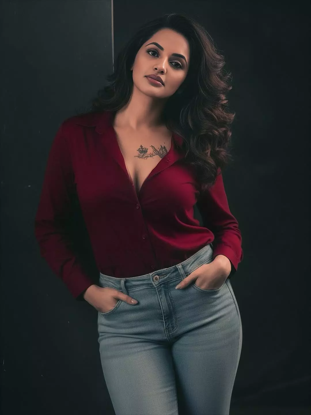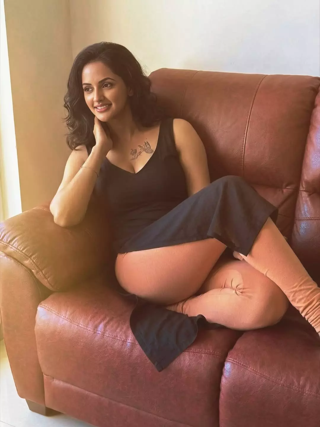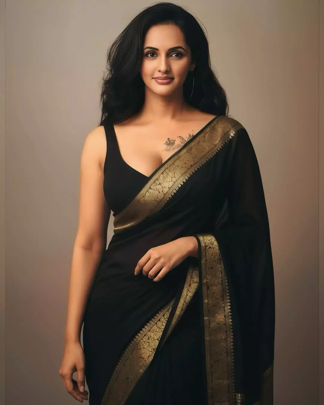 By: Tupaki Gallery Desk | 18 April 2026 4:11 PM ISTIn a warm and sophisticated new portrait, Jyoti Poorvaj (also known as Jyothi Rai or Jyothi Poorvaj) sits gracefully on a leather couch, exuding quiet strength and elegance. Dressed in a sleek black V-neck sleeveless dress that highlights her figure, with one hand gently running through her wavy dark hair and a subtle chest tattoo visible, the actress delivers a poised, captivating gaze under soft golden lighting.