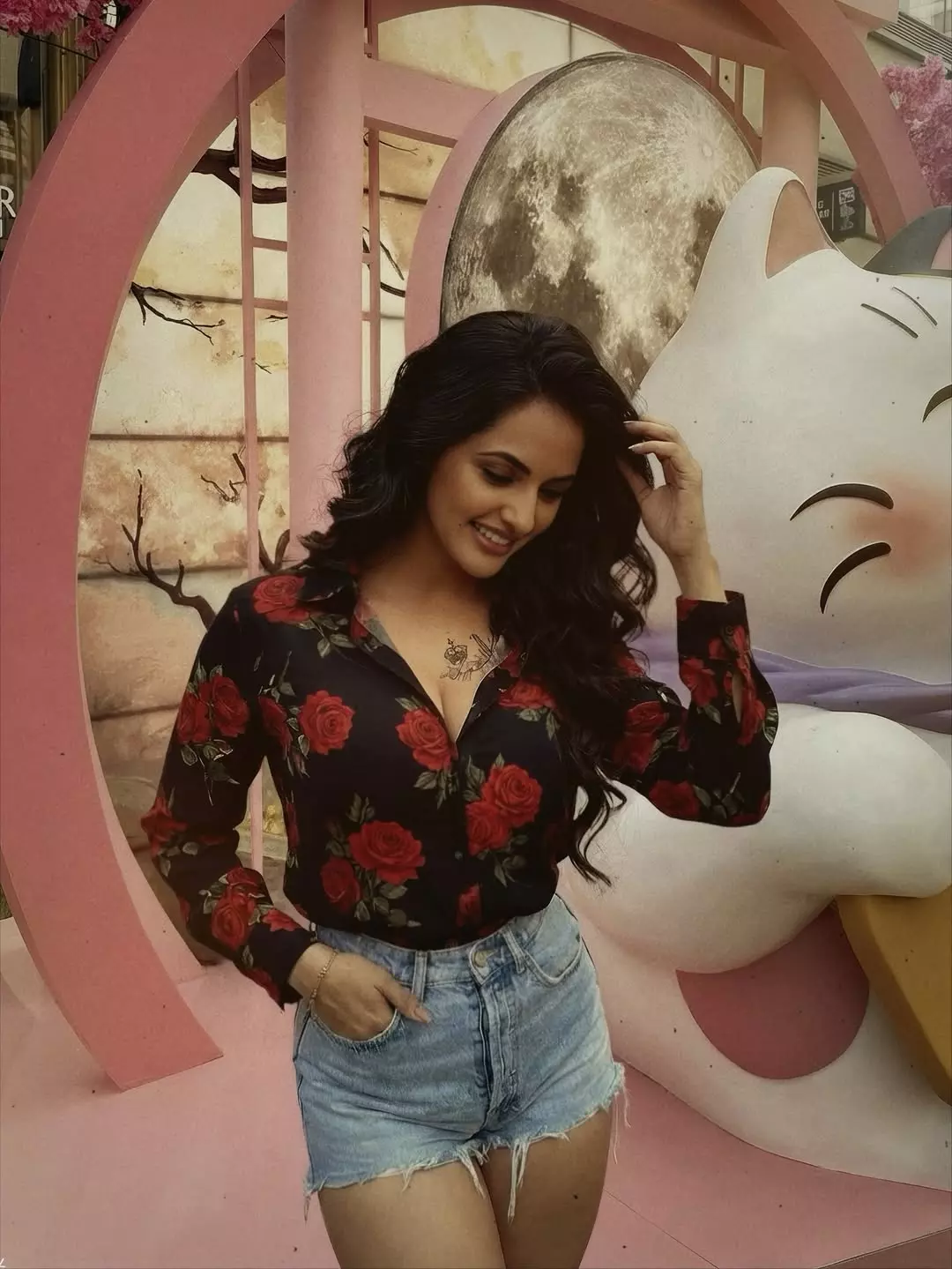 By: Tupaki Gallery Desk | 17 April 2026 1:53 PM ISTJyoti Poorvaj, the popular Kannada and Telugu actress, recently turned heads with a vibrant new photograph. Posing confidently in front of a playful pink-themed backdrop featuring a large moon and a giant cat figure, she looked radiant in a black floral shirt with red roses and frayed denim shorts. With a warm smile, hand in her pocket, and fingers gently running through her wavy hair, the image perfectly captures her charming and approachable style.