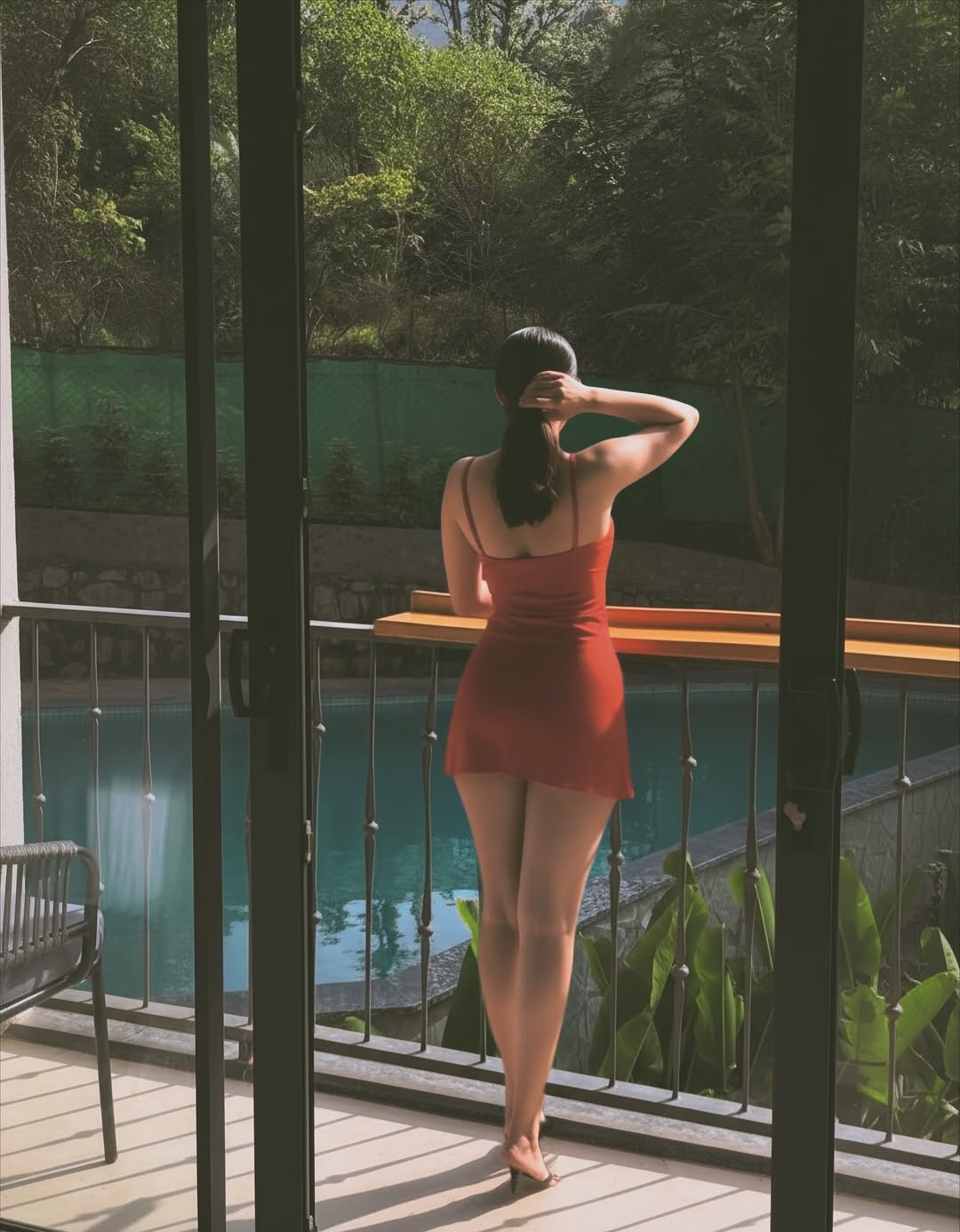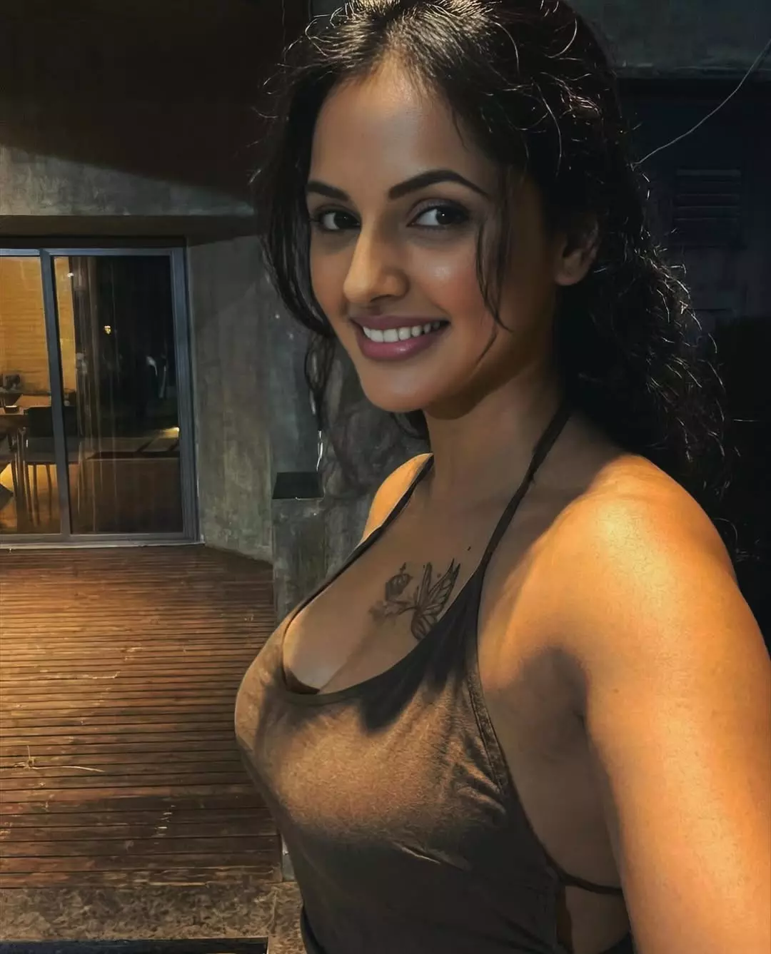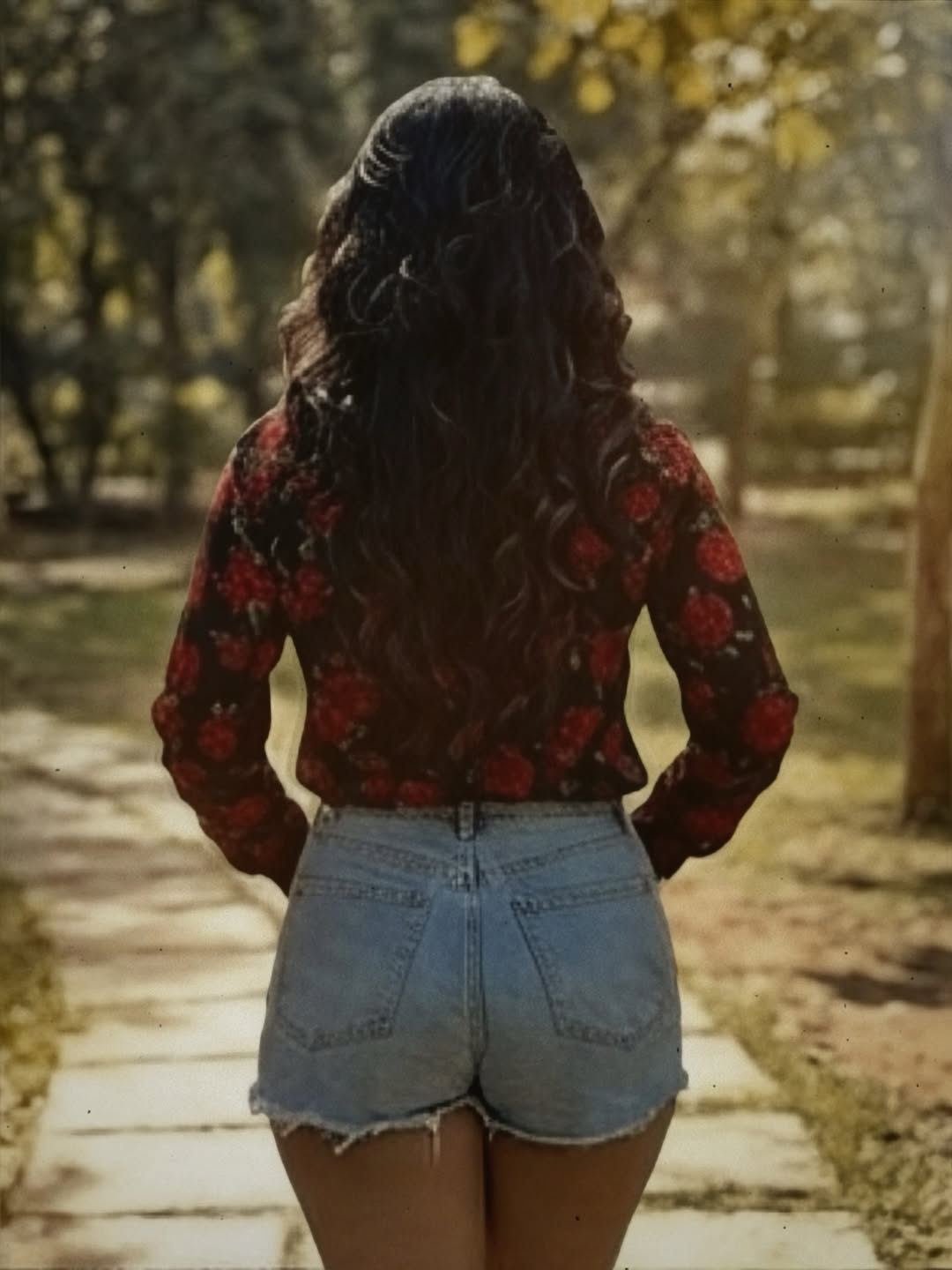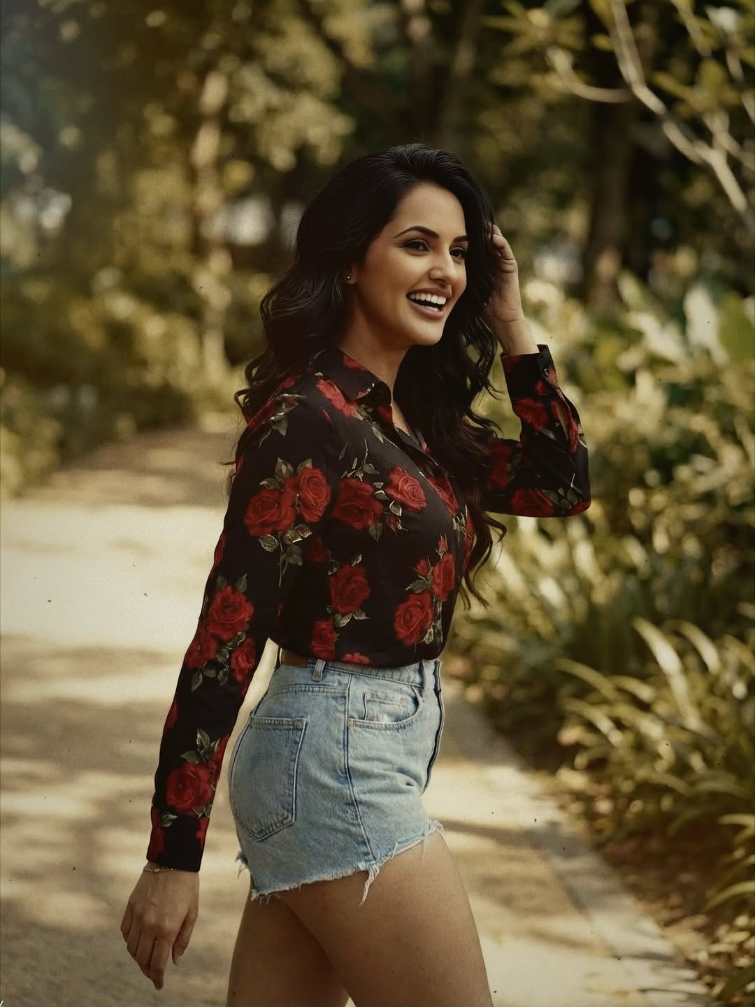 With a warm smile, hand in her pocket, and fingers gently running through her wavy hair, the image perfectly captures her charming and approachable style.