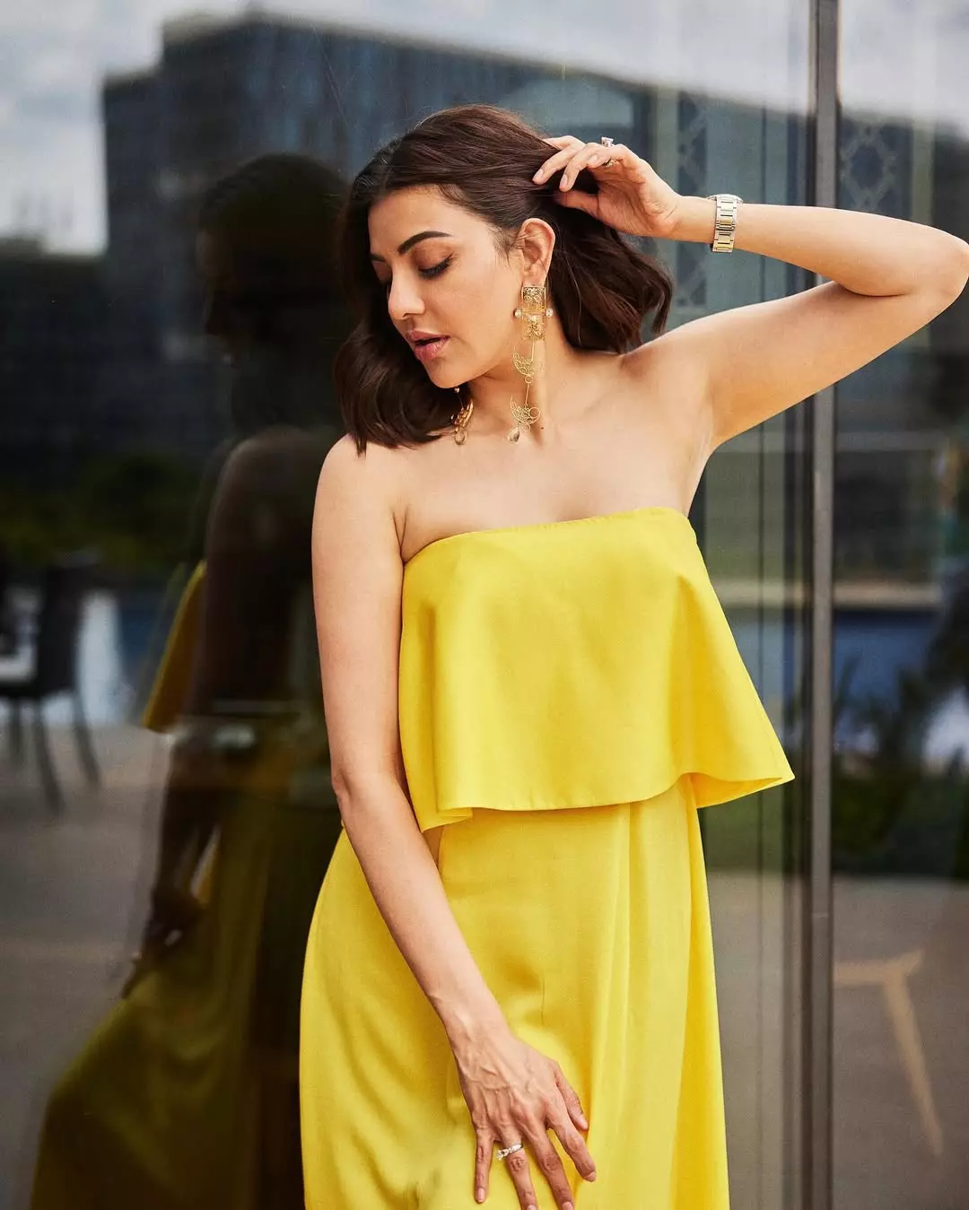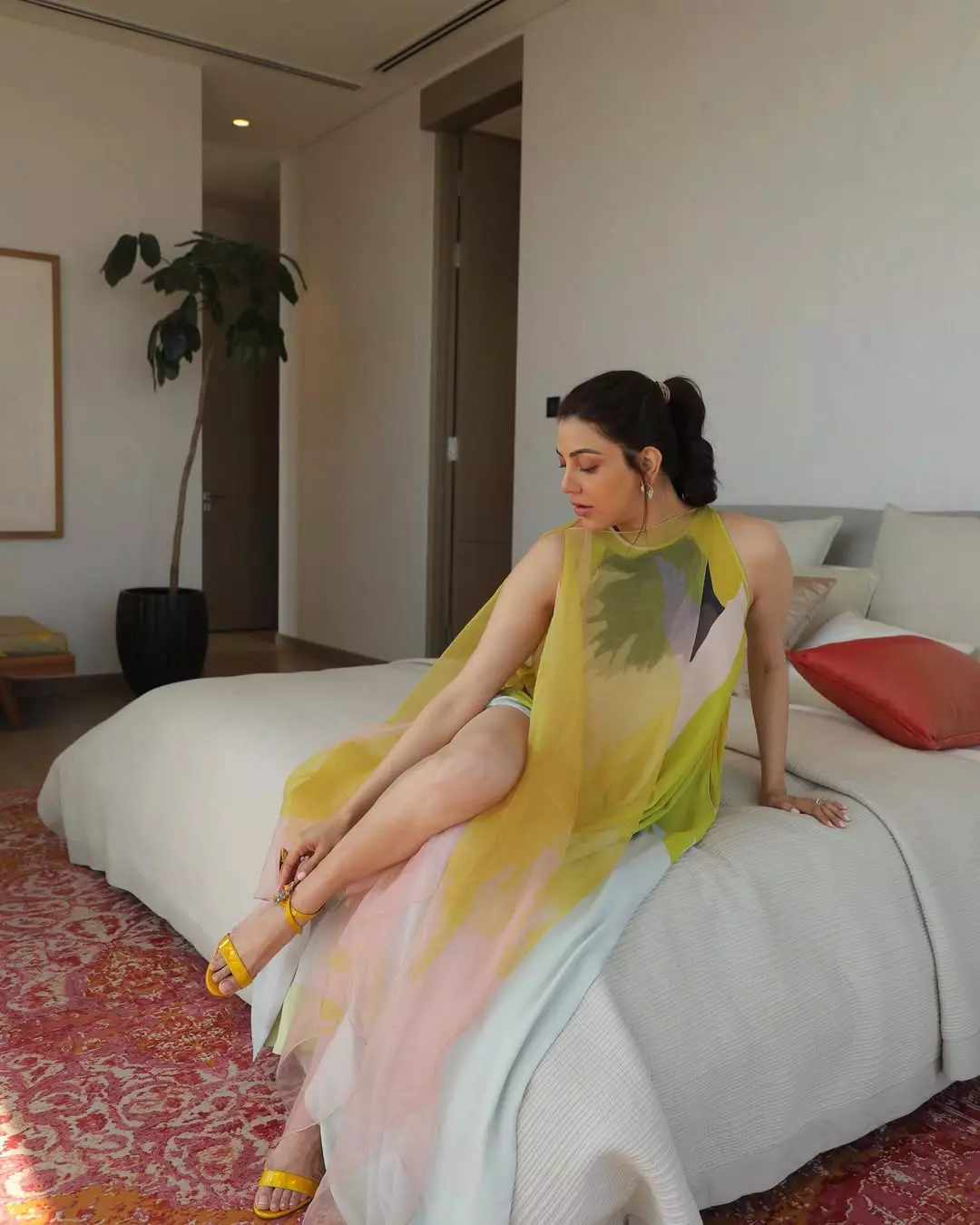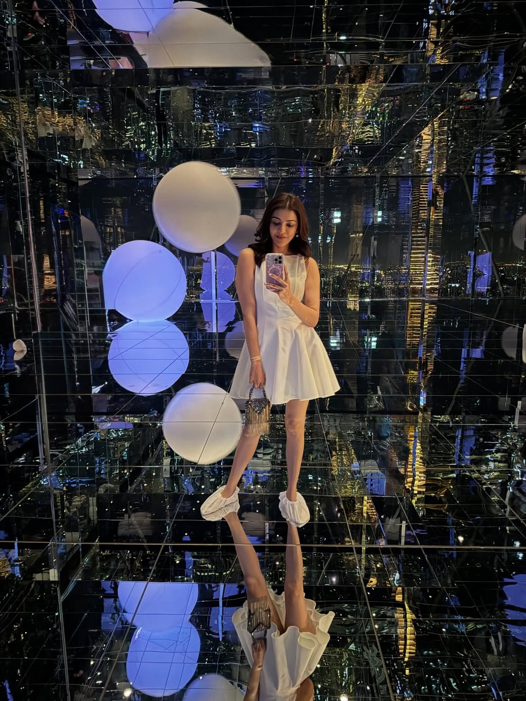 Kajal Aggarwal radiates ethereal joy in this mesmerizing photoshoot, captured amid an immersive installation of glowing lanterns in soft pastels, creating a dreamlike mirrored infinity effect. Dressed in a pristine white sleeveless dress with a flowing skirt, she playfully forms a heart with her arms, embodying hope and celebration as the year transitions.