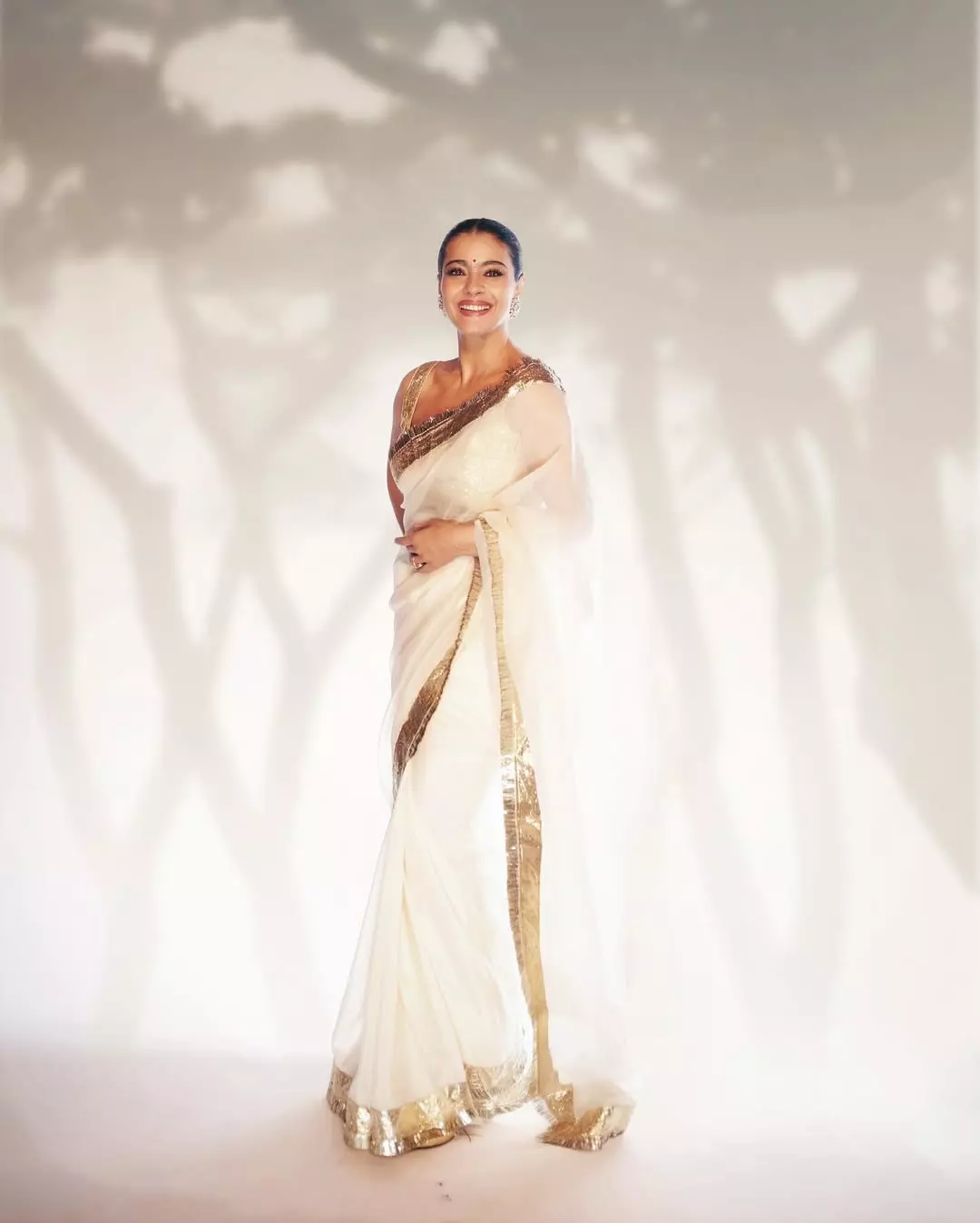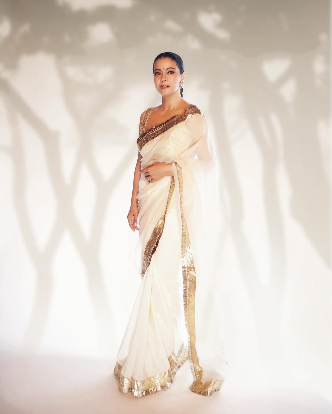 Kajol in her recent Instagram pic is seen in white saree. The photos are shared by fashion stylist Radhika Mehra and the style of kajol in these pics are just wow. Though she is in her 50’s, she looks like she is in 20’s in this saree.