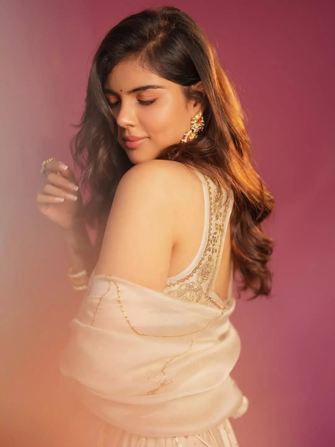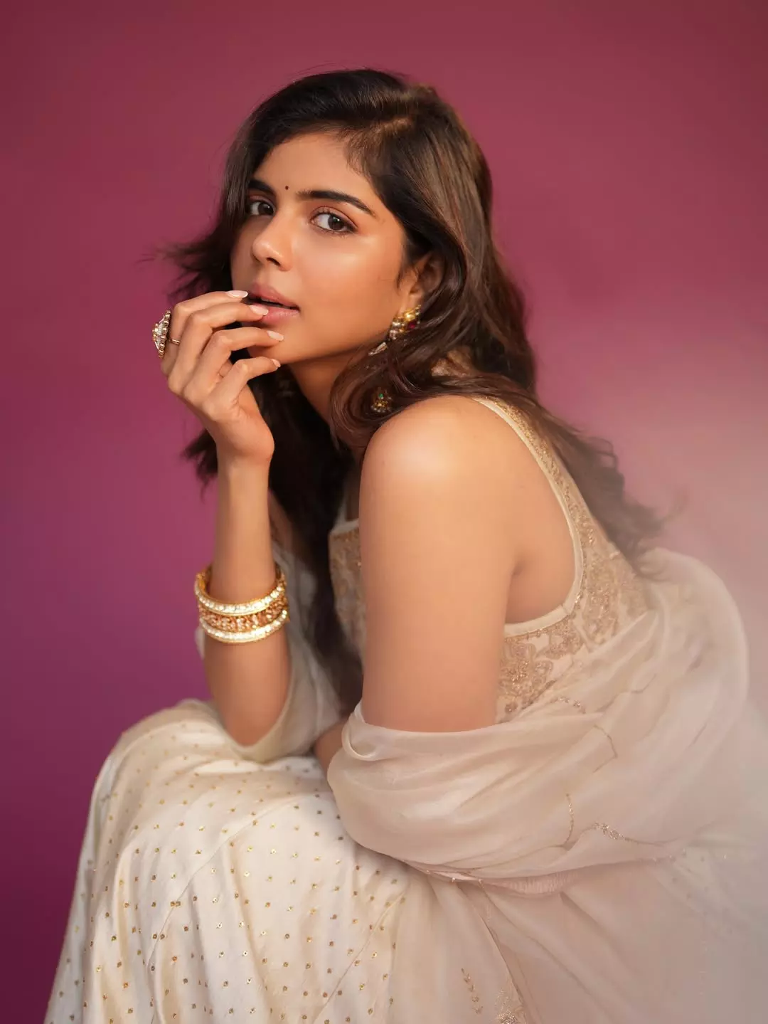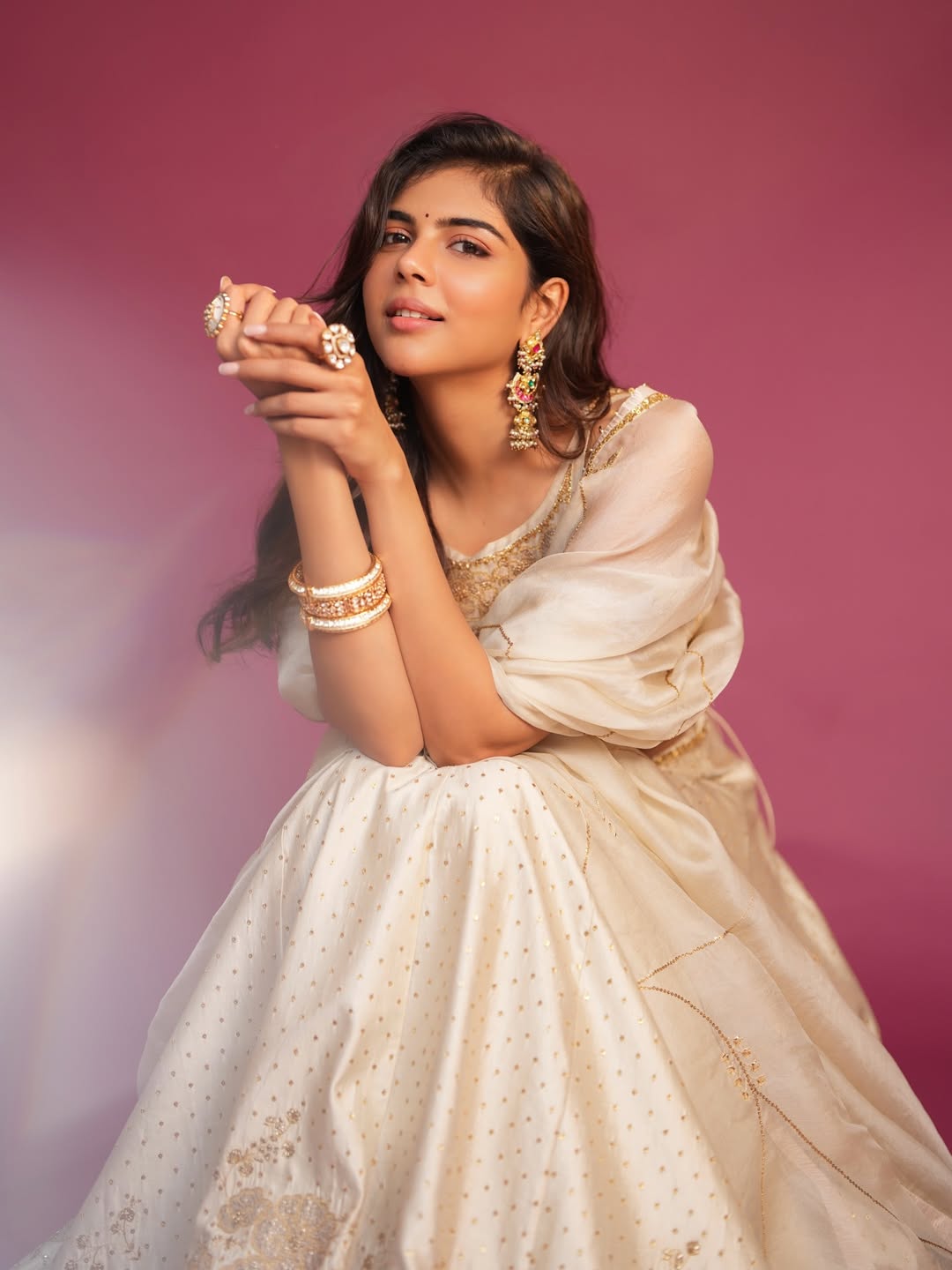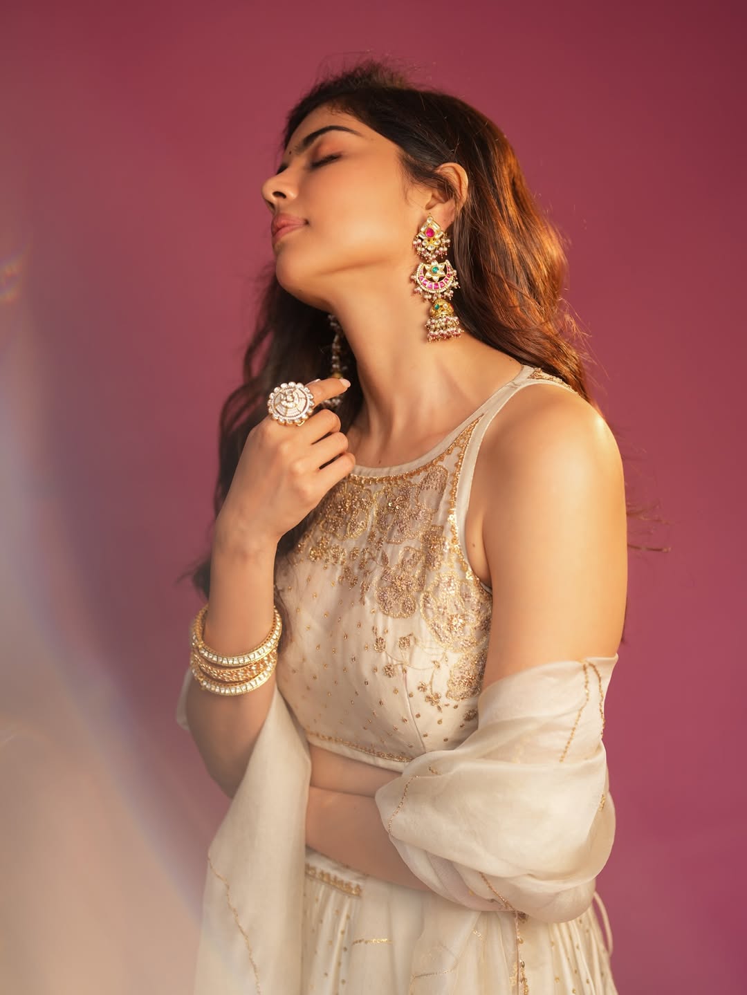 Kalyani Priyadarshan enchants in these radiant portraits, glowing with effortless charm and elegance against a vibrant pink backdrop. Dressed in a stunning cream-gold embroidered lehenga with intricate detailing, delicate jewelry, and soft waves, the actress exudes poise and modern grace in this fresh photoshoot.