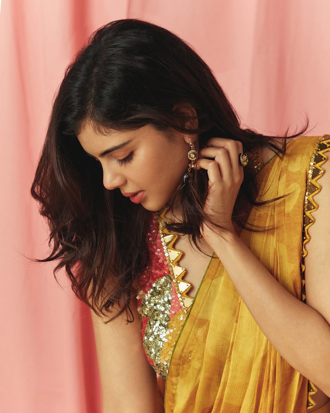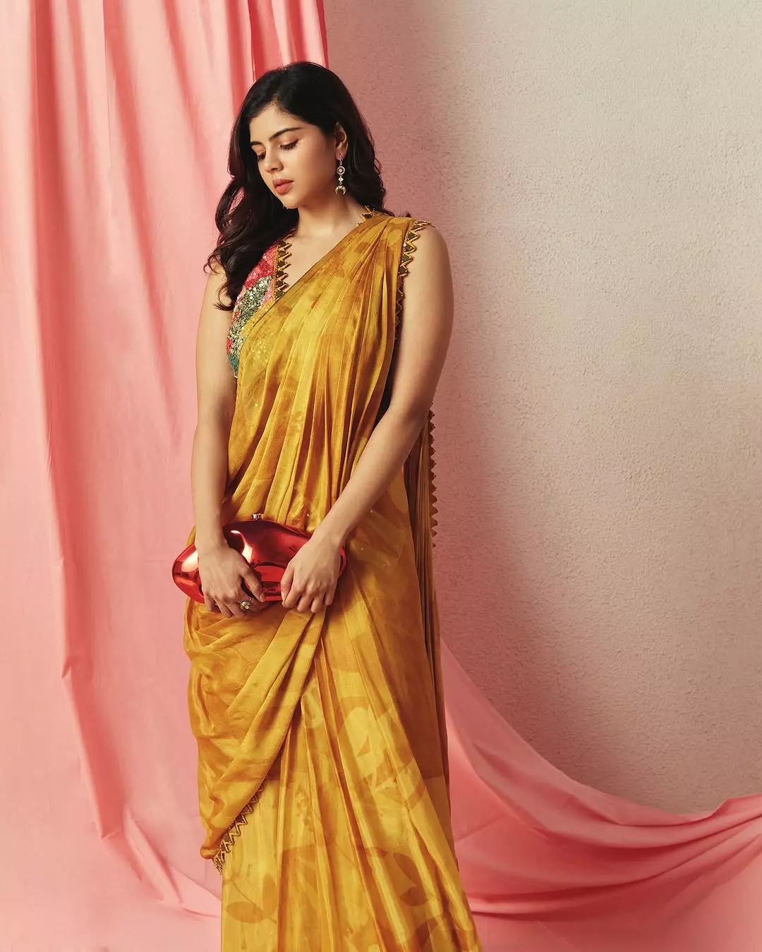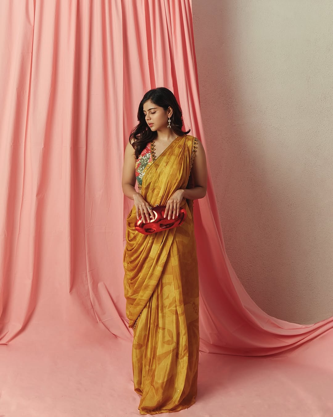 Apart from film, she also shares her fashion sense on Instagram. She recently posted a picture in a mustard yellow saree. It had soft folds and a subtle shine. She paired it with a floral blouse. The colors added a fresh touch. She carried a red clutch. The contrast made the look stand out.