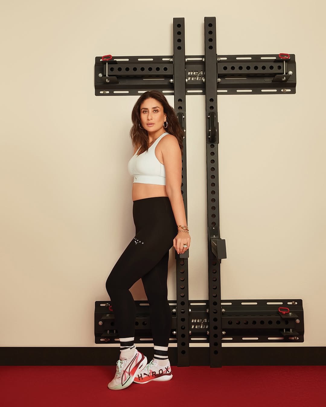 Kareena Kapoor shared a new photo on Instagram. She posed in activewear from PUMA. This post was a paid partnership with PUMA India. She wore a light blue sports bra and black leggings. She paired the look with white sneakers and striped socks. She stood confidently against gym equipment. Her caption read, “Trust PUMA to make me sweat.. and still serve. 🤣❤️ Click the link in my bio and check out my favourite styles.”