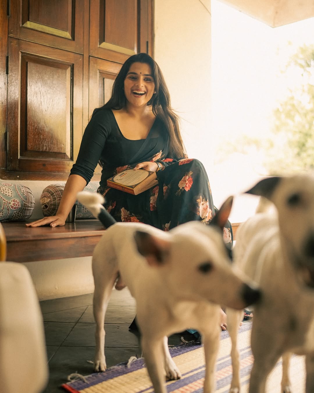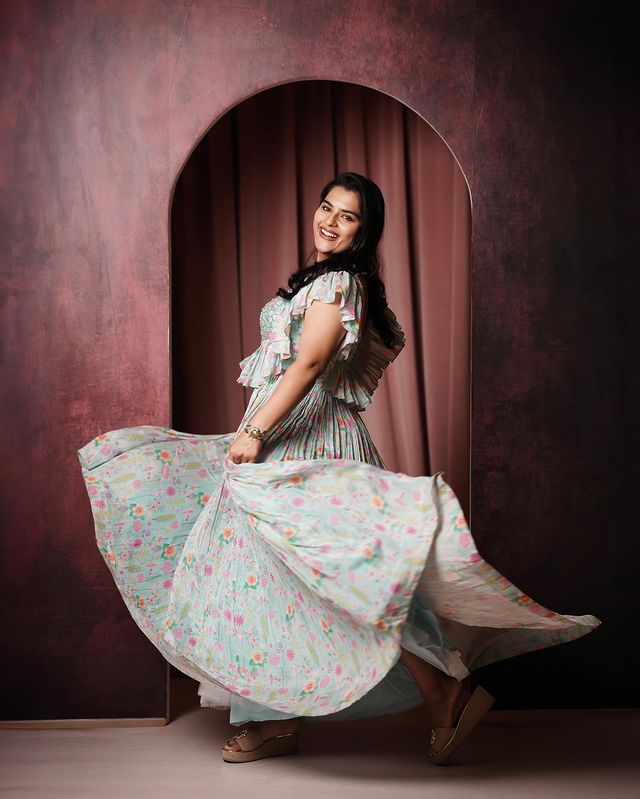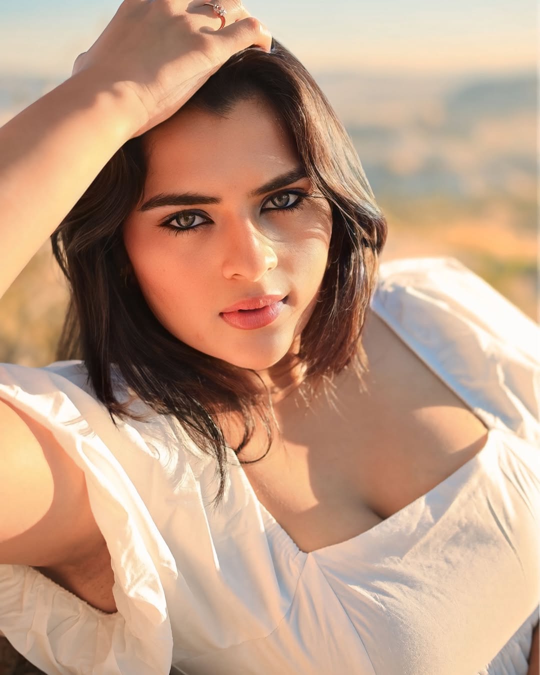 Kavya Kalyanram recently shared a image on Instagram potraying her beauty saree . In the picture, Kavya looks radiant, as the natural setting of the combined with the wind in her hair, creates a captivating aura.