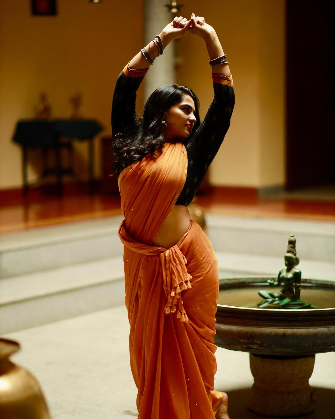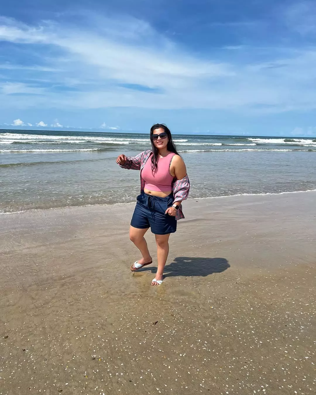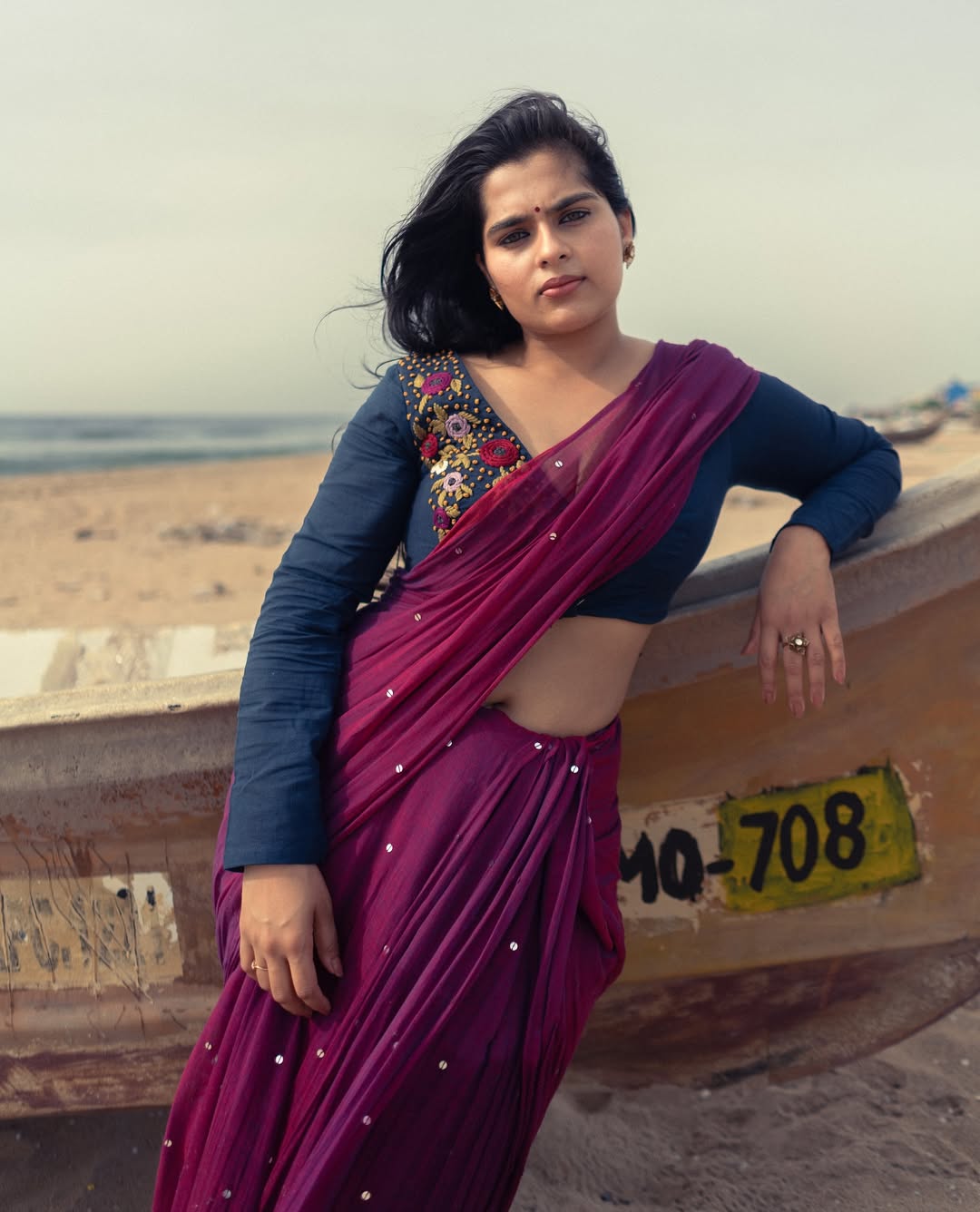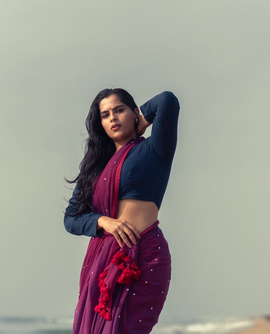 In this mesmerizing photo, Kavya embodies ethereal beauty on a serene beach, draped in a flowing magenta saree with subtle embellishments, paired with a navy embroidered blouse, her long hair windswept against the crashing waves and cloudy sky.As of early 2026, no major upcoming movie projects have been officially announced, but fans anticipate her next captivating role soon.
