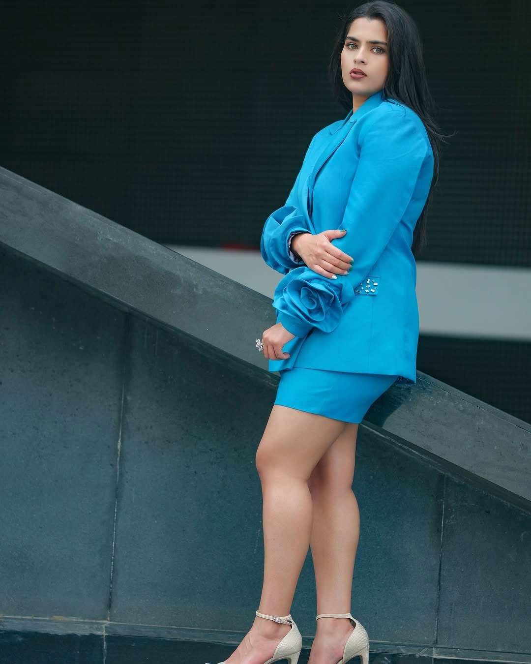 By: Tupaki Desk | 30 May 2025 9:36 PM ISTKavya Kalyanram recently shared a photo on Instagram that caught everyone�s attention. Wearing a stylish blue blazer dress with unique floral sleeves and shining crystal details, Kavya looked elegant and confident. She posed casually against a dark wall giving off a modern vibe.