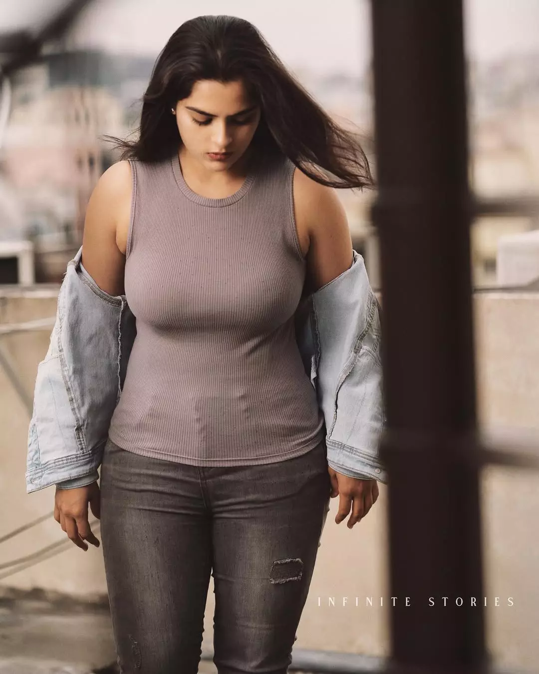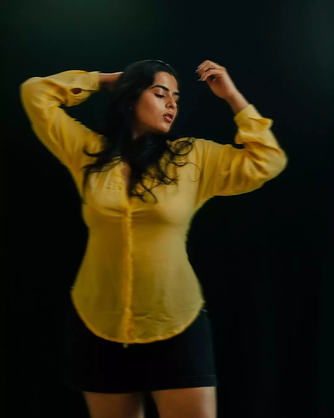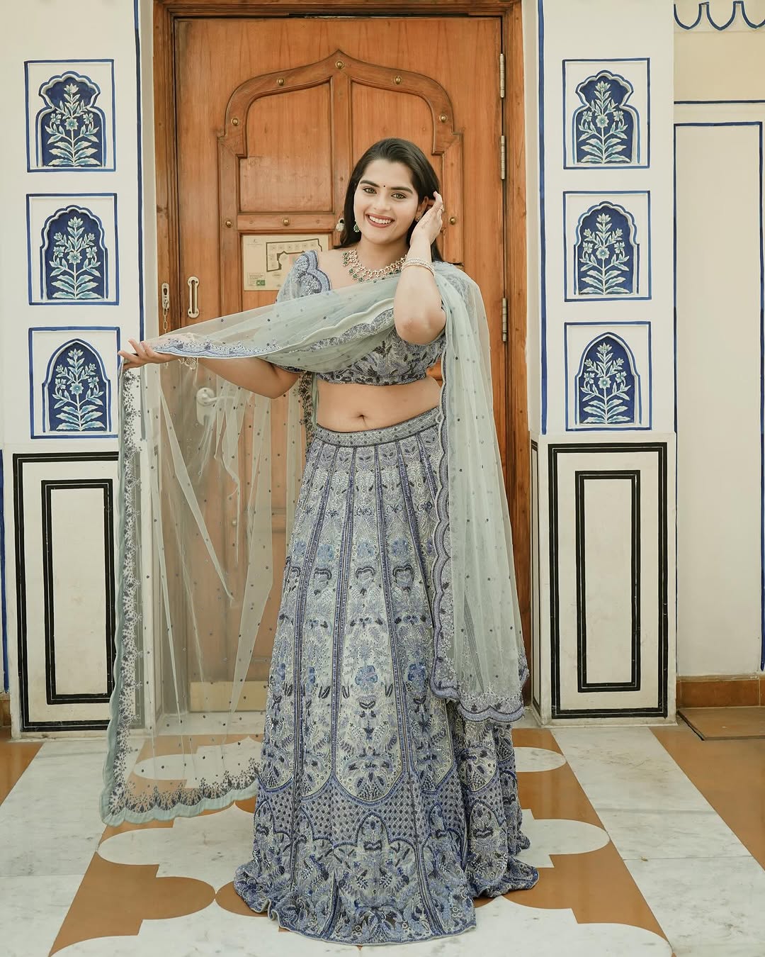 Kavya Kalyanram beams with joy and confidence in this lively indoor photo, casually posing in a light pink crop top and blue jeans. With one arm raised and a bright, infectious smile, she exudes natural charm and youthful energy that has made her a favourite among Telugu cinema audiences.