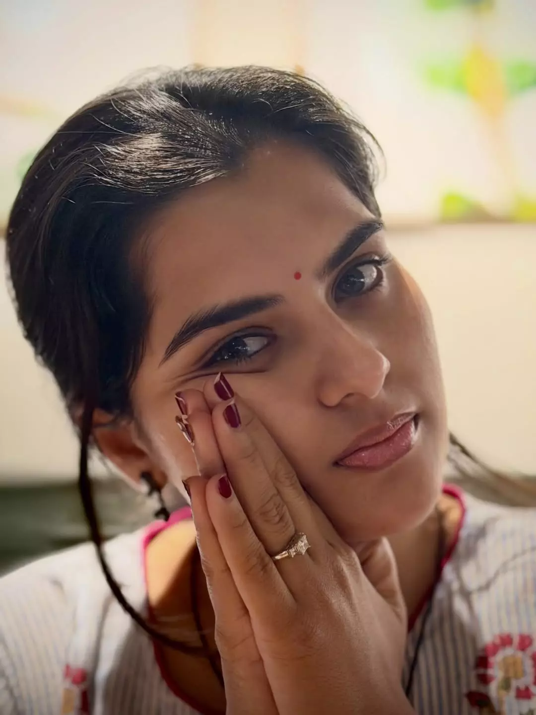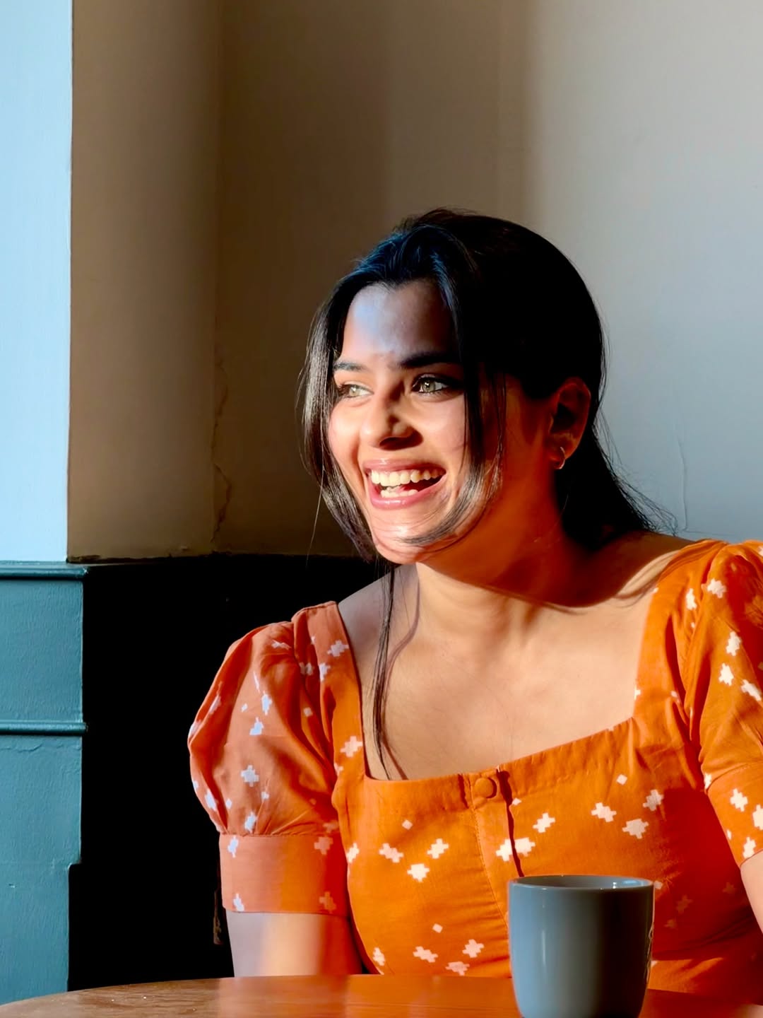 Kavya Kalyanram beams with infectious joy in this heartwarming candid photograph, captured in a cozy café setting.