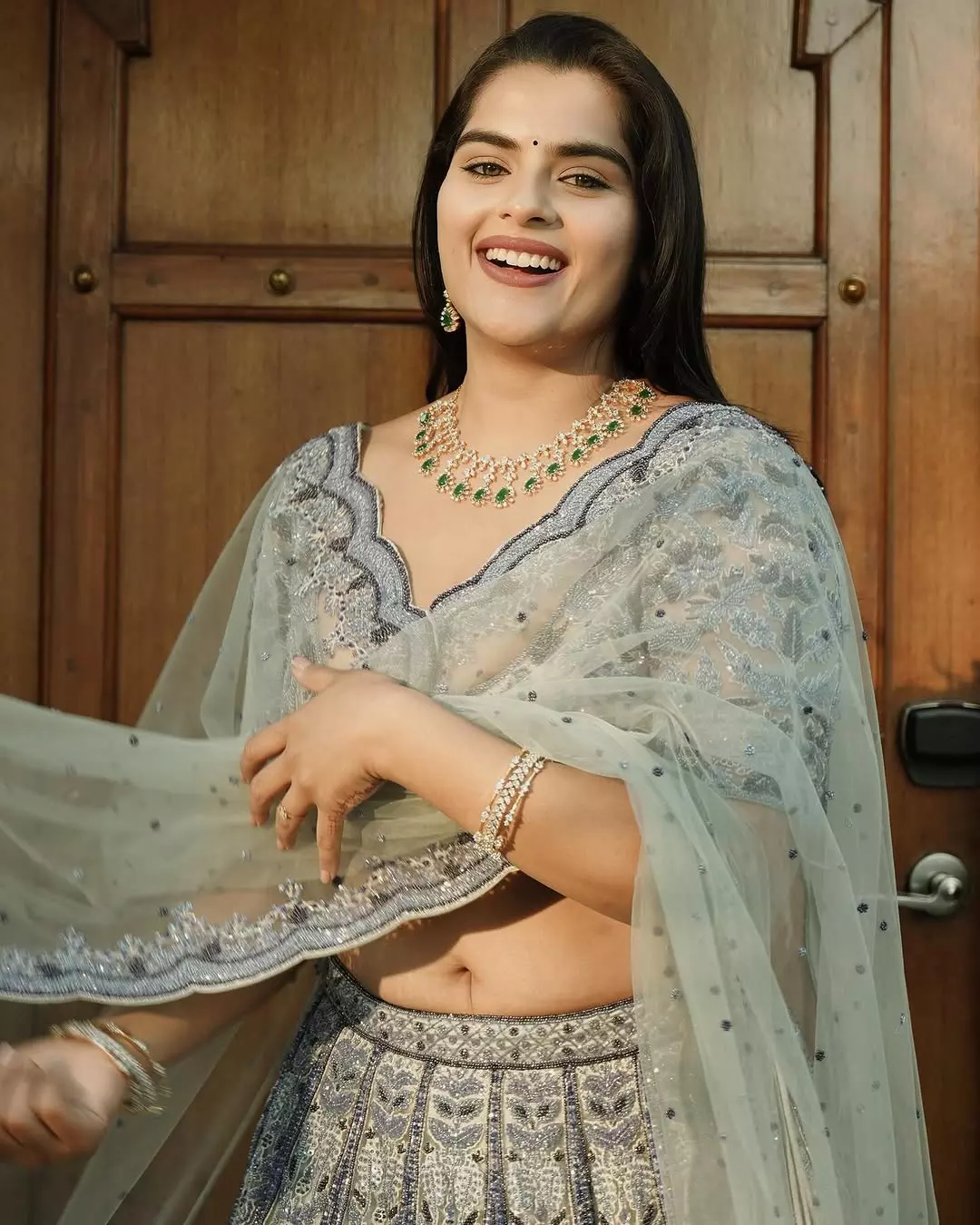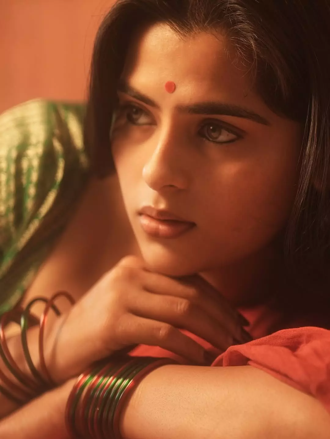 Kavya Kalyanram radiated ethereal charm in this captivating portrait, captioned LEFTOVERS . . . . , evoking a sense of nostalgic allure. Bathed in warm amber lighting, she gazed thoughtfully with expressive eyes, a vibrant red bindi adorning her forehead, and multiple colorful glass bangles adorning her arms. Draped in a traditional green and red saree blouse, the close-up highlighted her natural grace and cultural elegance, blending innocence with quiet intensity in a beautifully intimate frame.