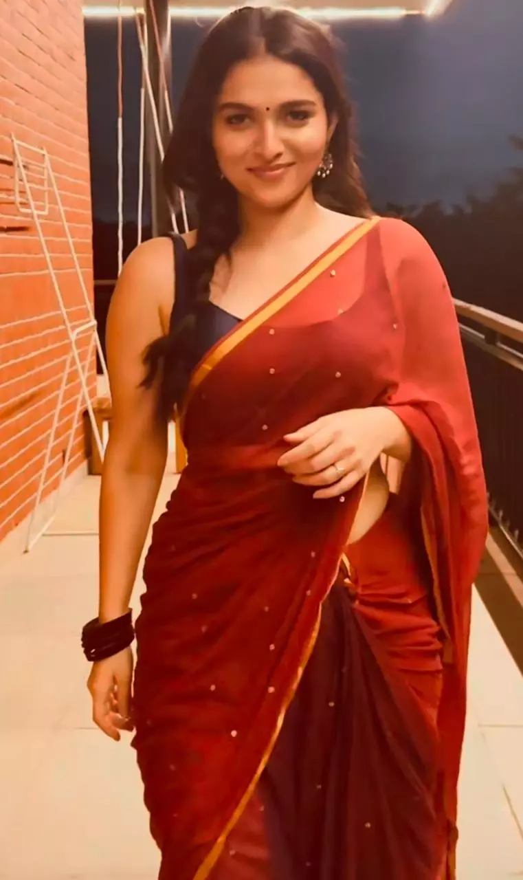The actress, known for her unique roles and style, is seen here wearing a traditional red saree that exudes elegance and charm