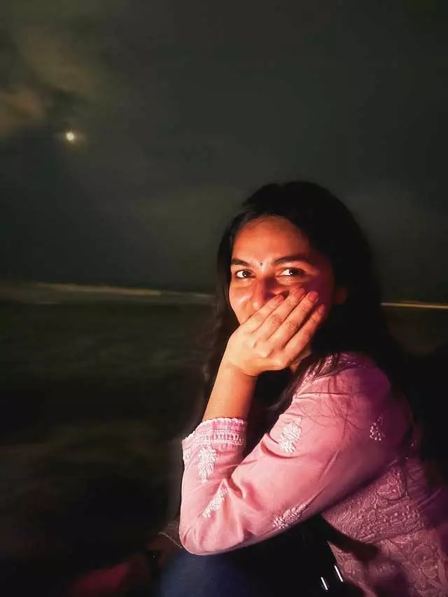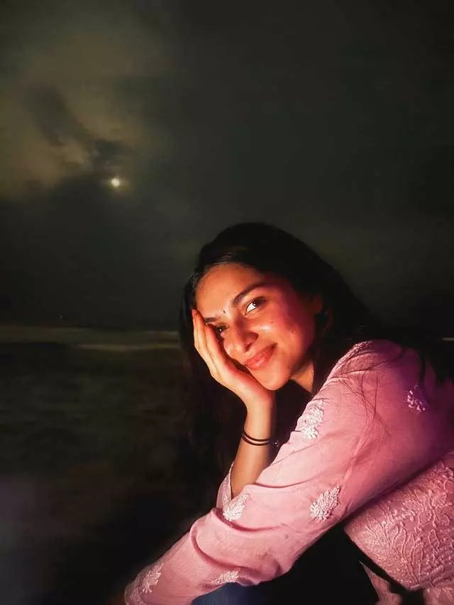 Kayadu Lohar posted a calm photo on Instagram. She shared a peaceful moment under the night sky. In the photo, she sat by the beach at night. She smiled softly and gently covered her face with her hand. She wore a light pink kurta with white embroidery. The moon shone faintly in the background. Its light touched the dark waves quietly.