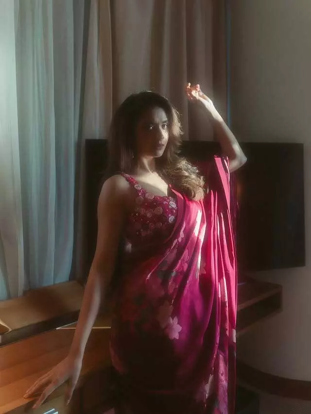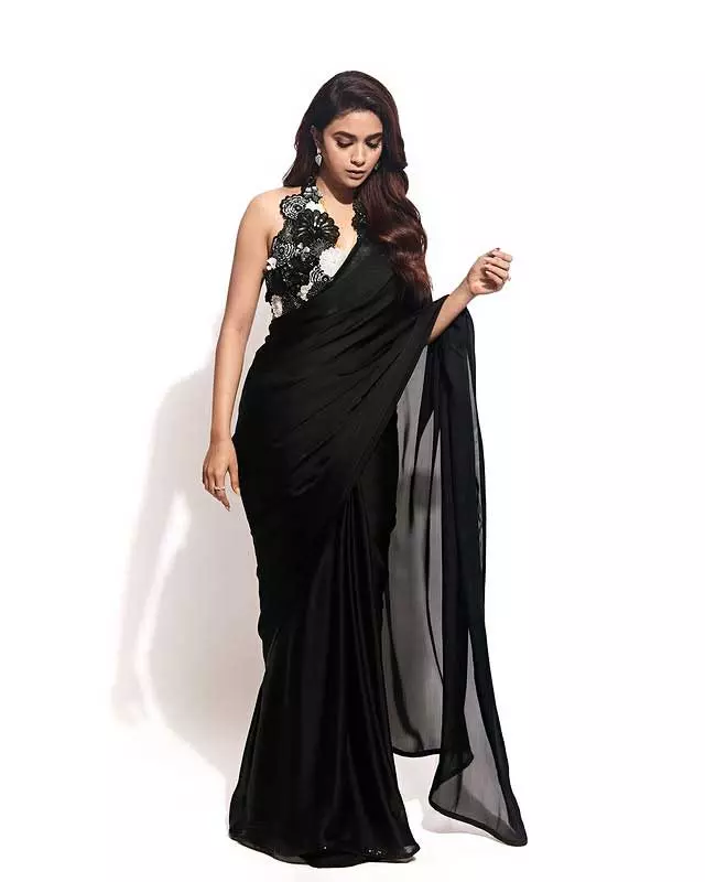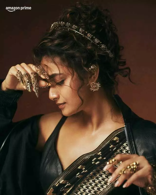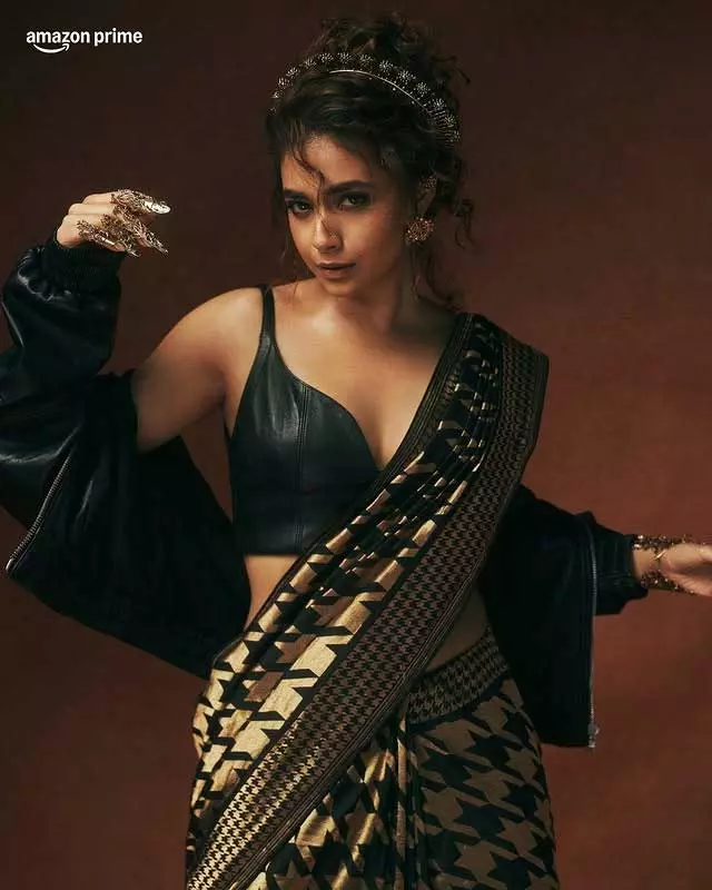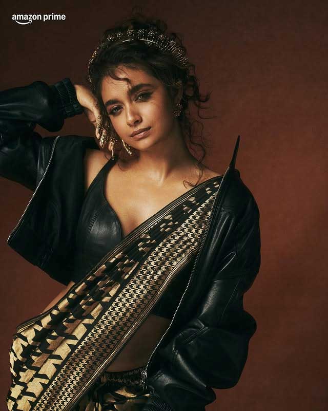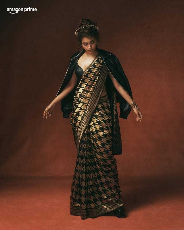 The actress looks adorable as she blends traditional and modern elements in her outfit. Sporting a chic leather blouse paired with a black and gold printed saree, she adds a contemporary edge to this timeless look. The statement jewelry, dramatic nails, and fierce pose elevate her style, embodying desi glam with a touch of drama, as perfectly captured in the Instagram caption: “Serving desi glam, glow, and a little bit of drama ✨📸.”