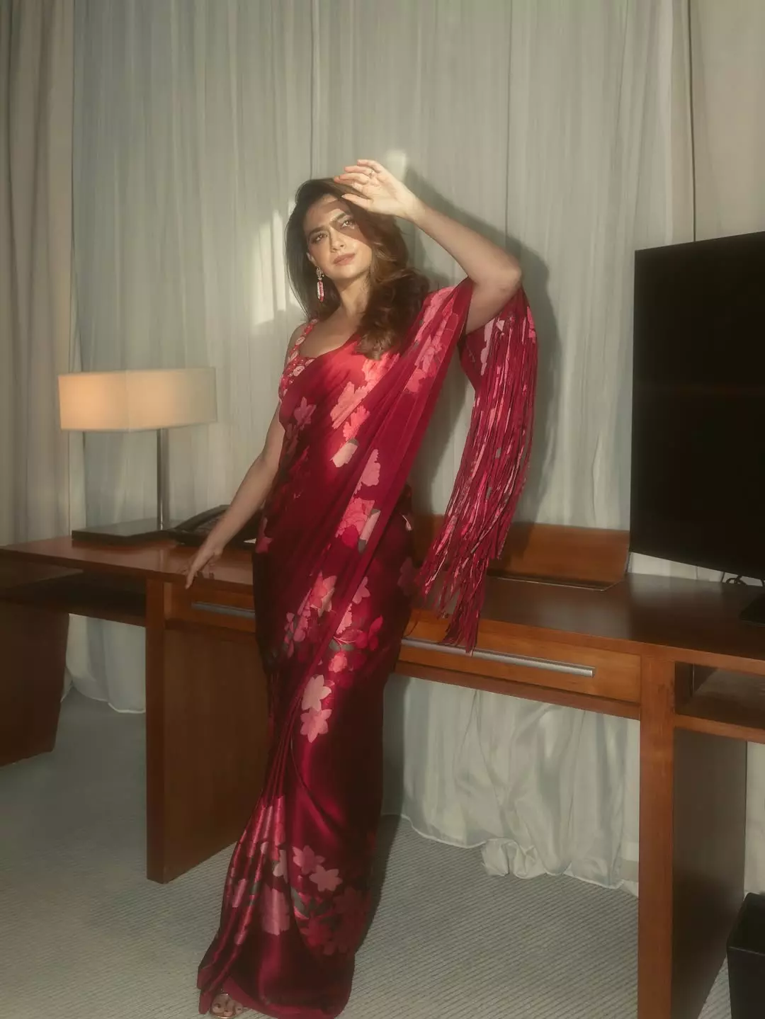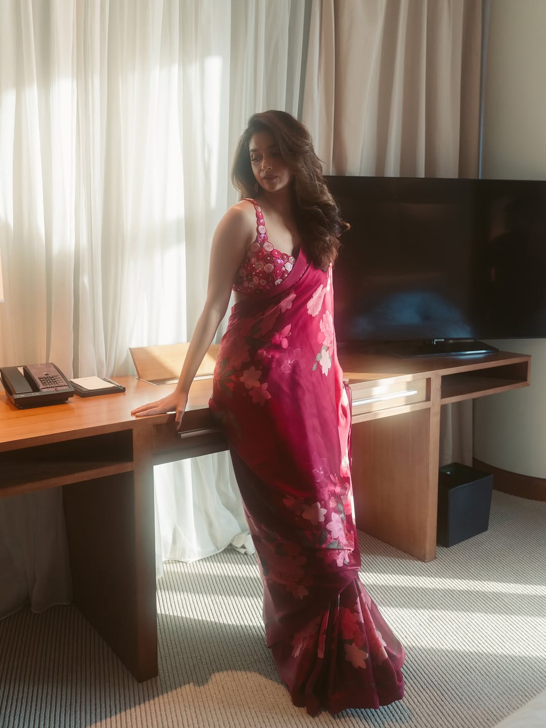 Keerthy Suresh recently posted a picture on Instagram from her Dubai trip, wearing a red saree with floral prints.