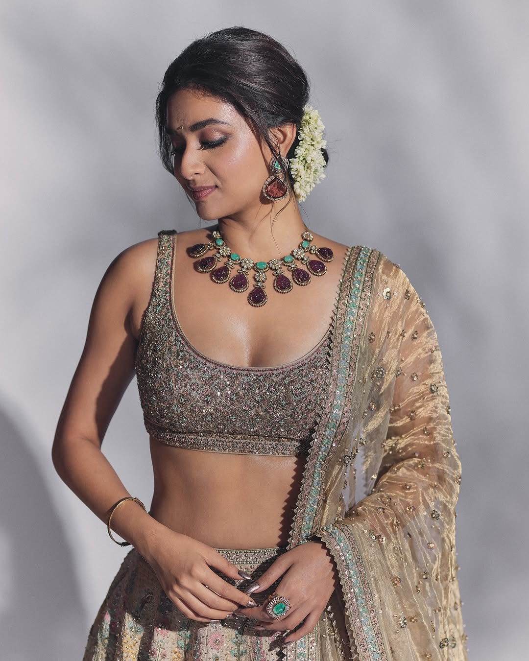 Her soft glam makeup, warm smile, and confident stance create a flawless balance of sweetness and elegance. The breezy green dupatta enhances the look, giving it a modern Indo-fusion touch. Each frame captures her calm poise, lively energy, and natural cuteness, making this gallery a treat for fashion enthusiasts.