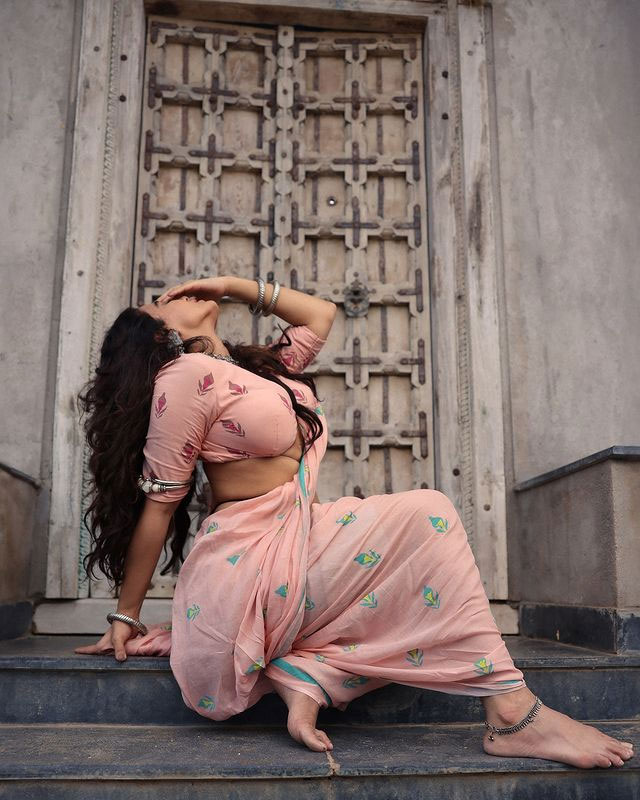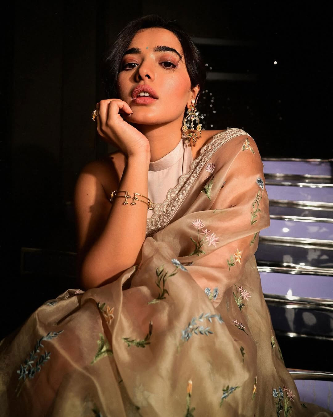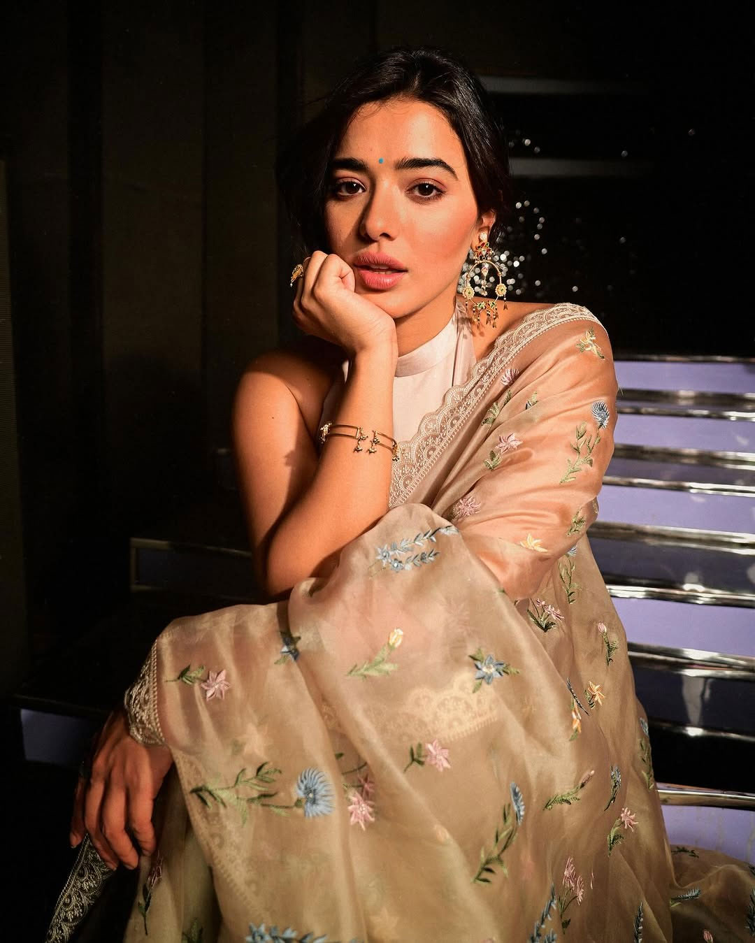 Kethika Sharma is turning heads on Instagram again! In her latest post, she captioned it simply: "Aura ✨"—and that’s exactly what she brings. The photo shows Kethika wearing a stunning pastel saree from @mavurisilks, styled beautifully by @niha__varma. The delicate floral embroidery and lace border give it a soft, elegant charm. Her jewelry from @sheetalzaveribyvithaldas adds just the right sparkle, while her glowing makeup and hair, done by @kiranmakeup and @thimmappa180, complete the look perfectly.