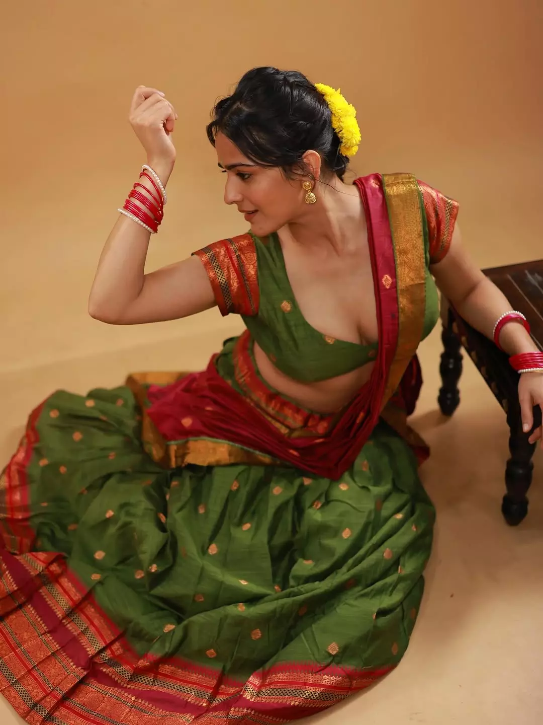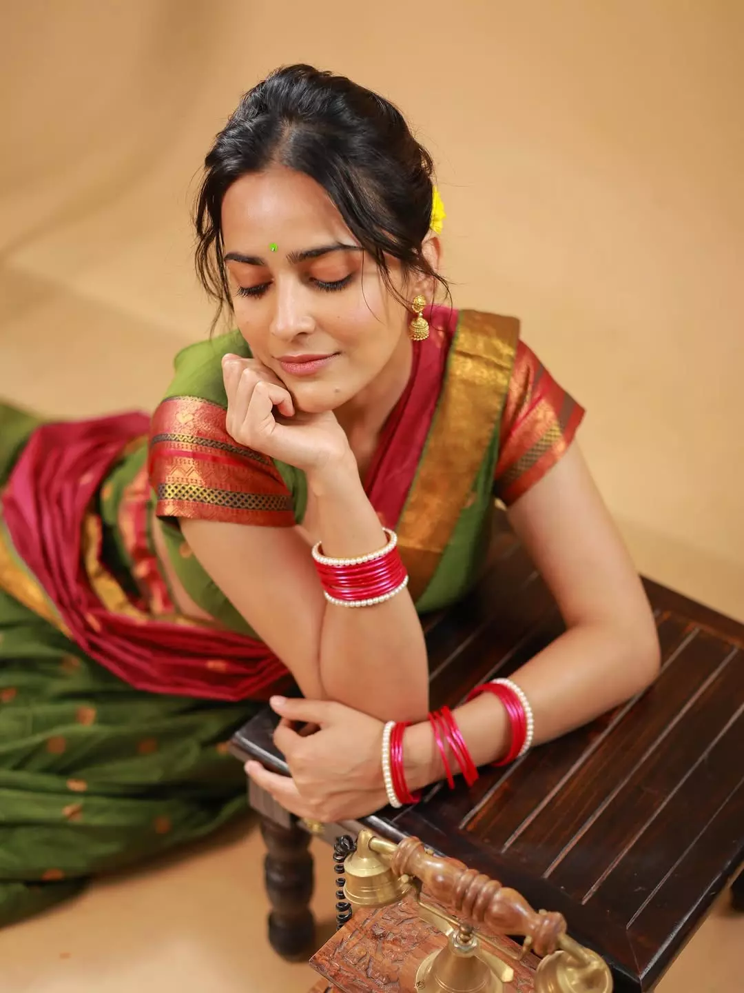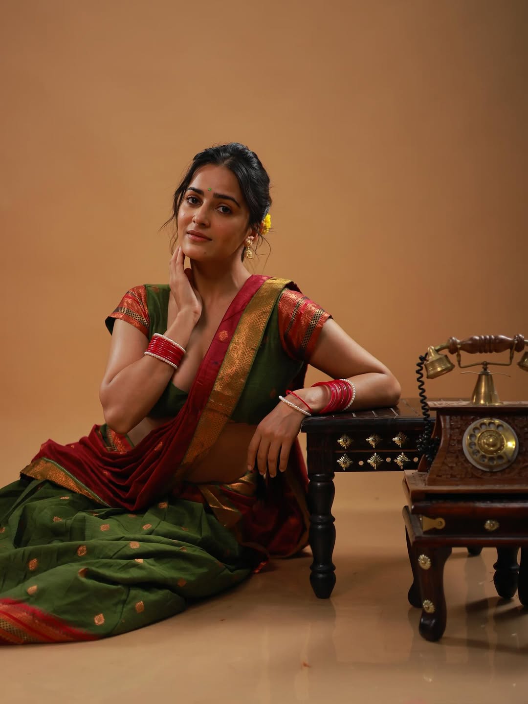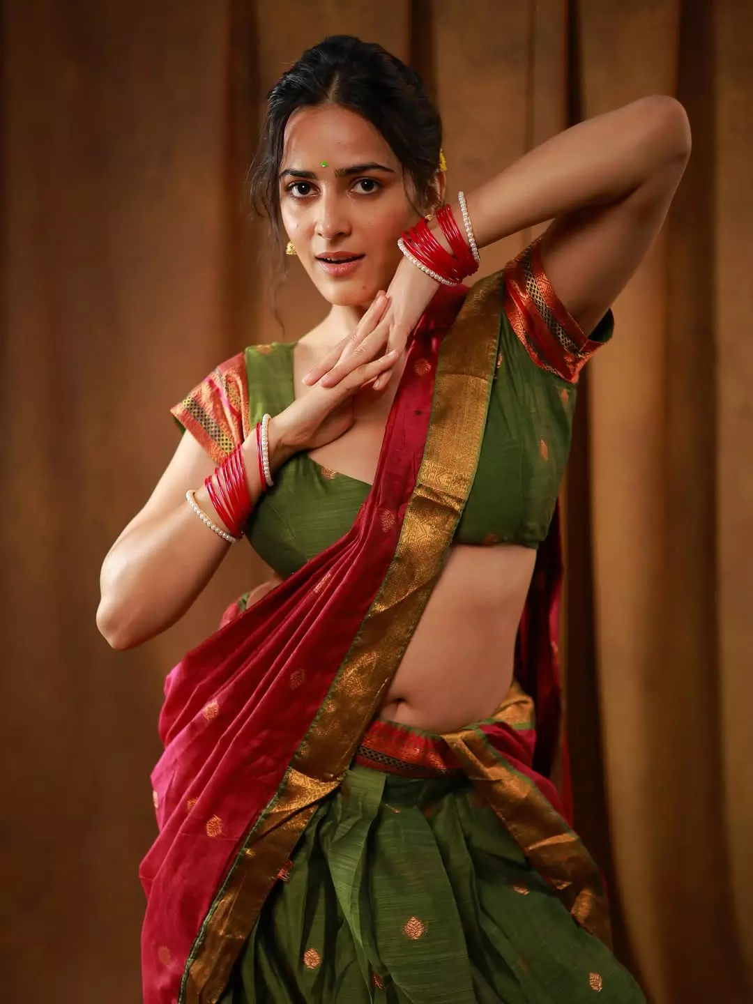 Khushboo Chaudhary shared a graceful post on Instagram on August 2 with the caption “प्रियतम.” She appeared in a traditional saree in rich shades of green and red. The saree had golden borders that added a festive touch to her look. She paired it with a matching green blouse with red sleeves, creating a balanced style. Her accessories included red bangles, a pearl bracelet, and small golden jhumkas.